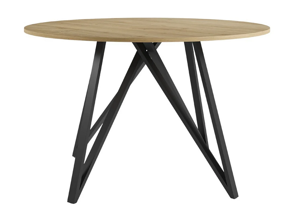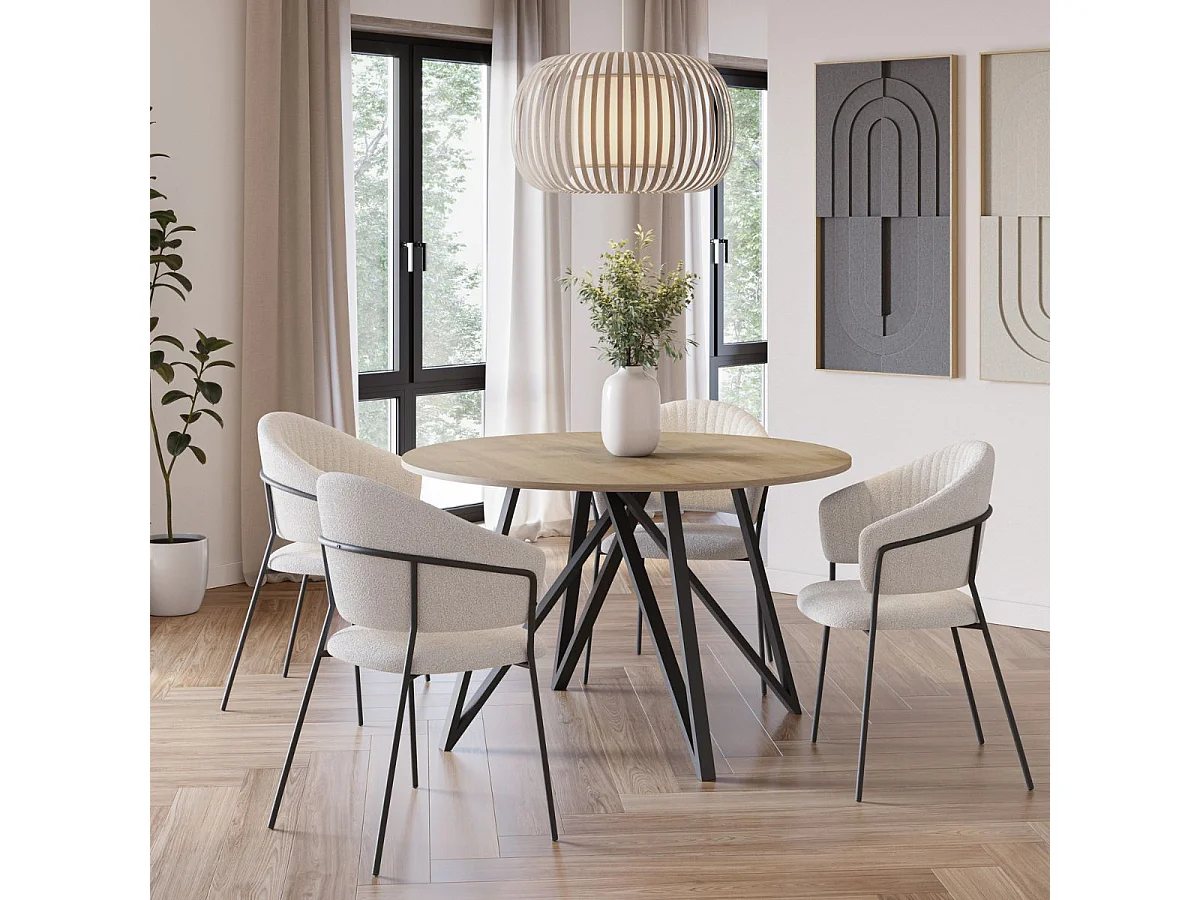 Table ronde Ø120cm plateau en mélaminé imitation chêne clair et pieds design en métal laqué noir - URIELLE