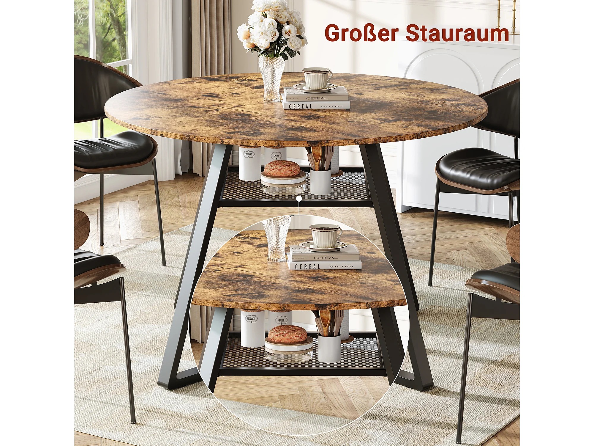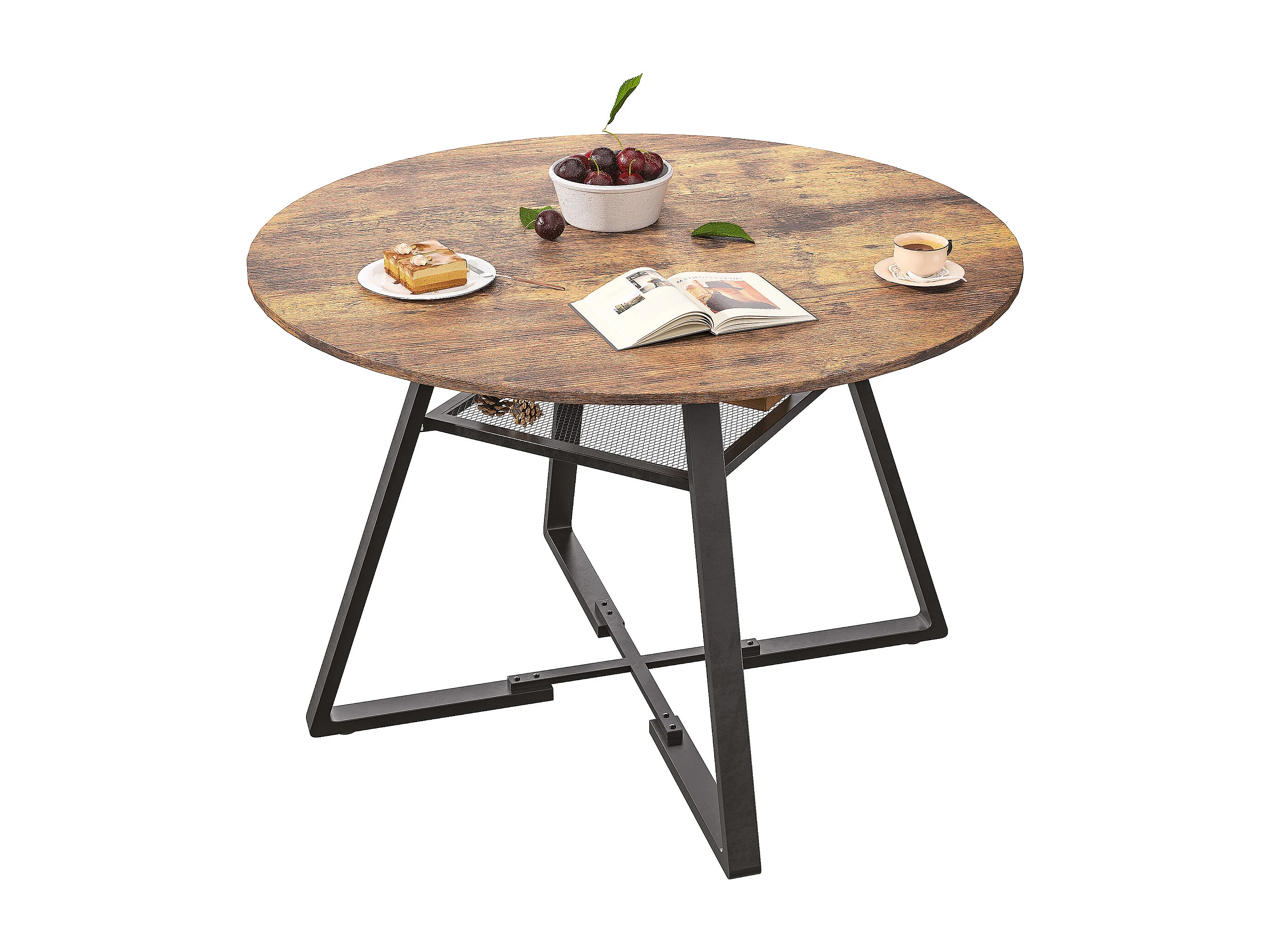 Table à Manger Ronde Industrielle 120 cm – Style Vintage avec Étagère de Rangement, 4-6 Personnes, Cuisine et Salle à Manger