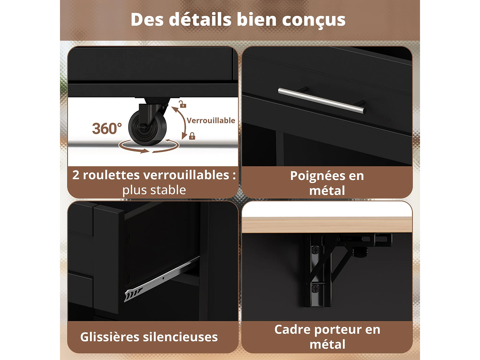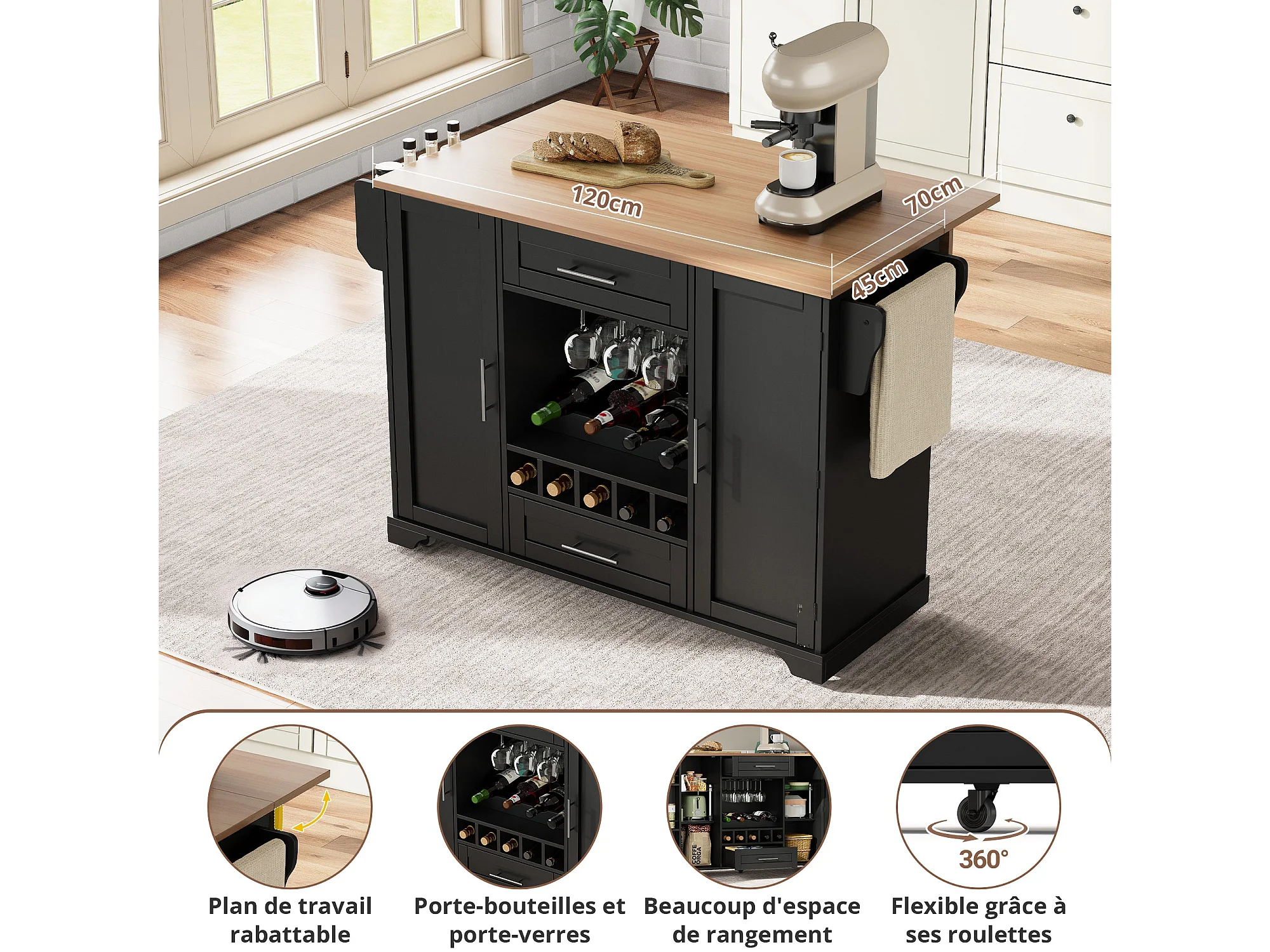 Table roulante de cuisine avec plan de travail rabattable, îlot de cuisine sur roulettes, 120x45/70x92cm, Chariot de service multifonctionnel avec rangements