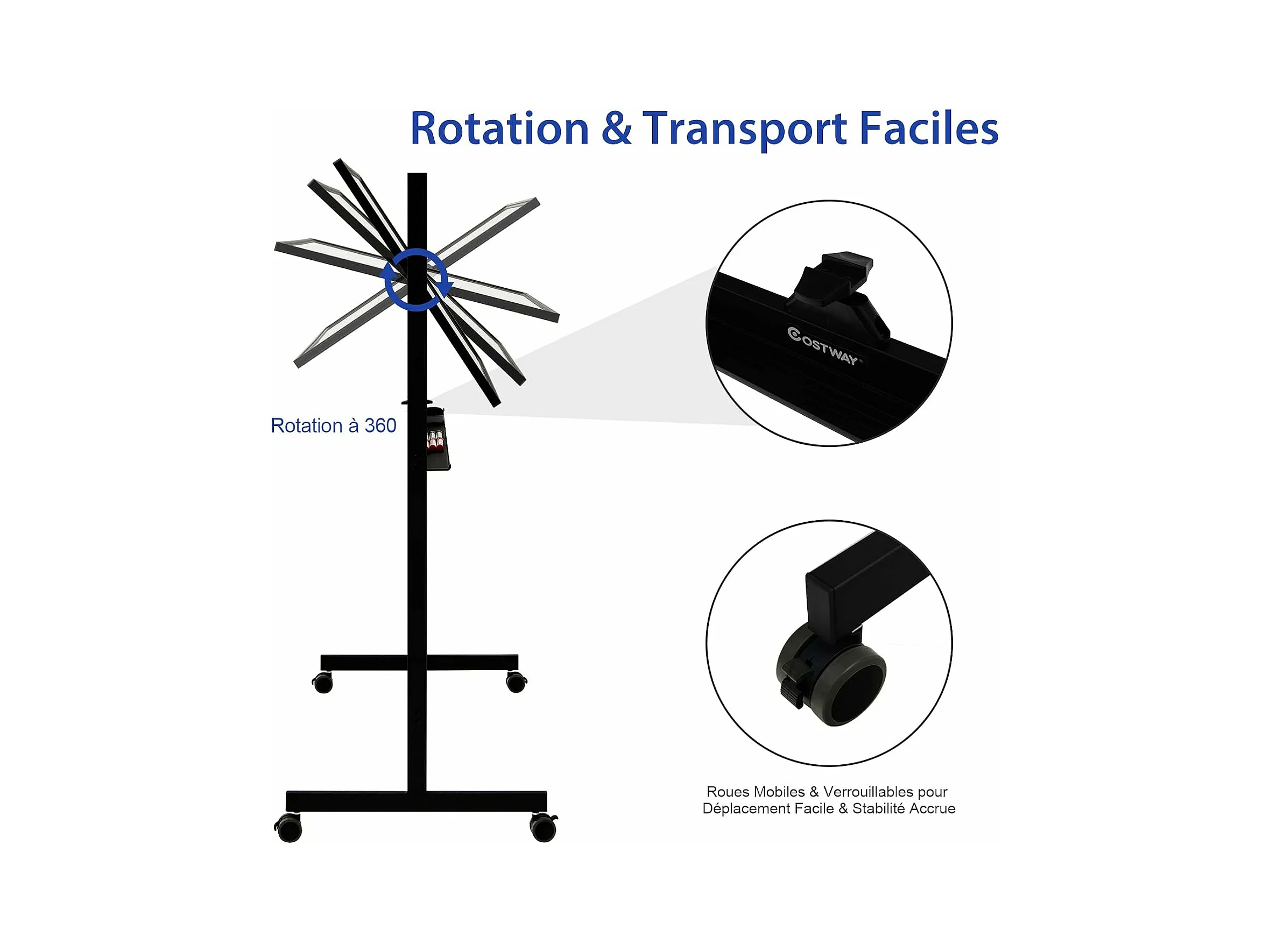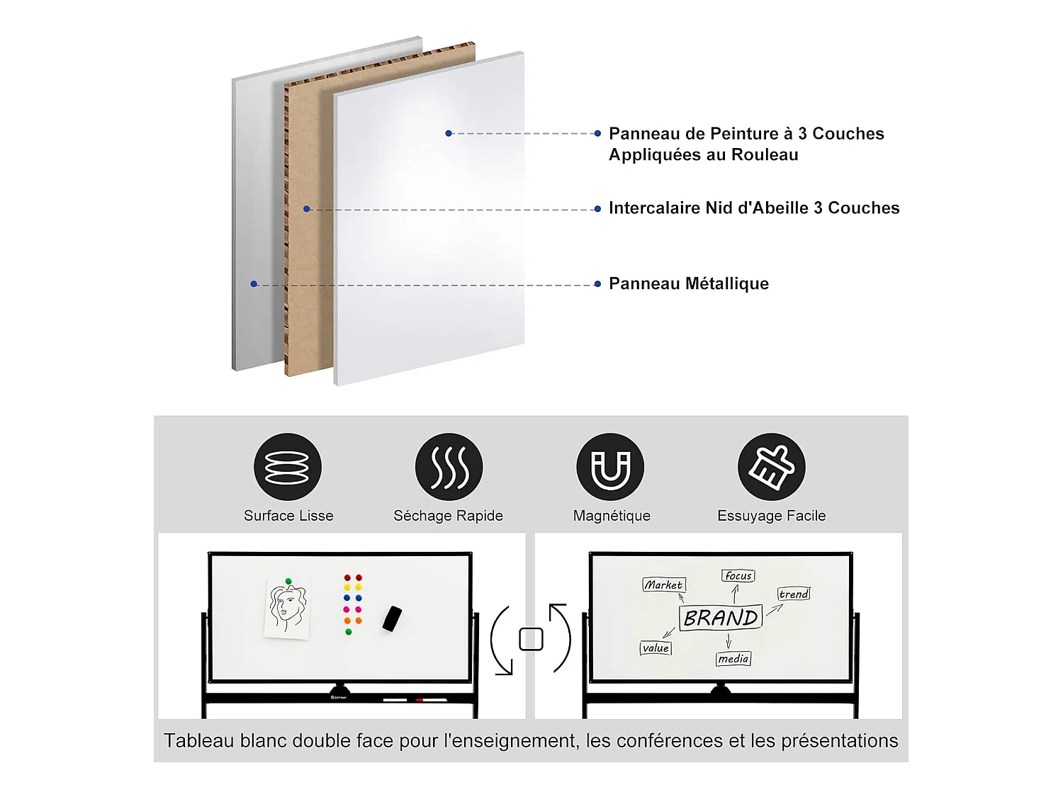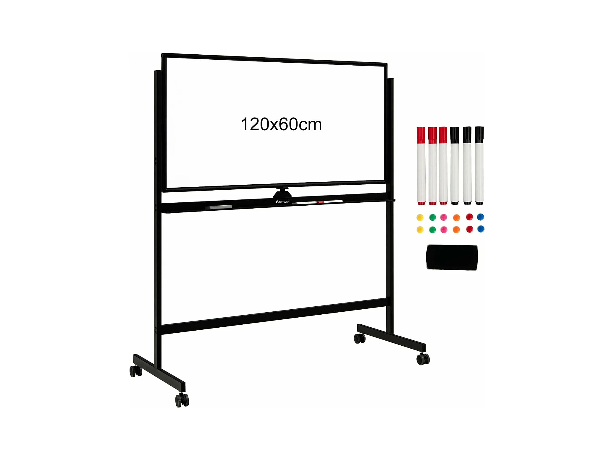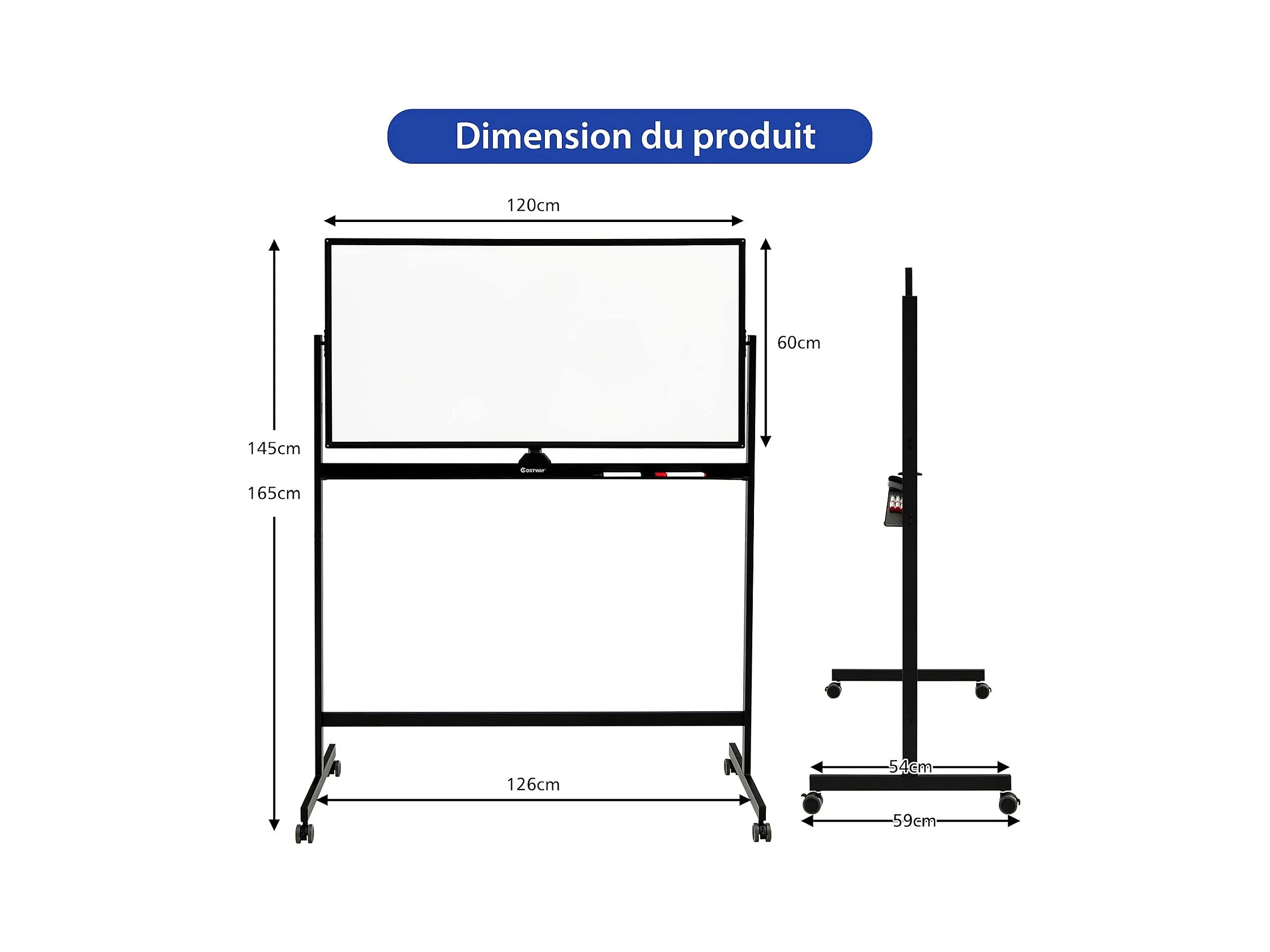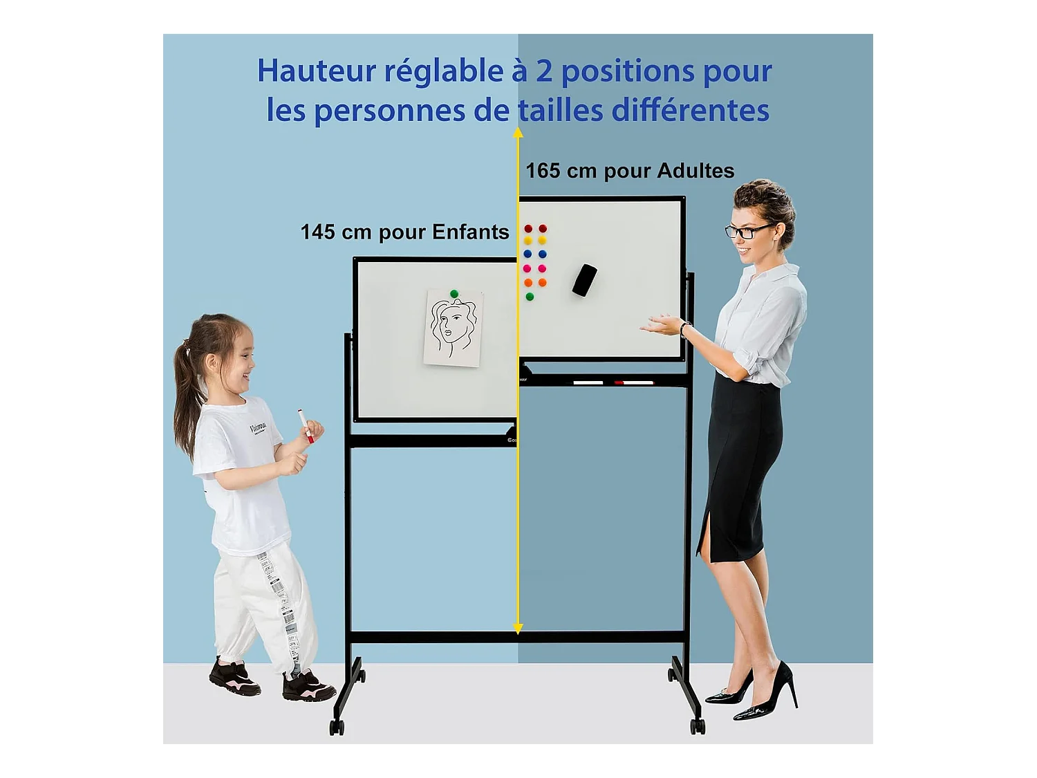 Tableau Blanc Magnétique 120x60cm Double Face Réversible 360° Mobile 2 Hauteur Effaçable à Sec 12 Aimants 6 Marqueurs Blanc