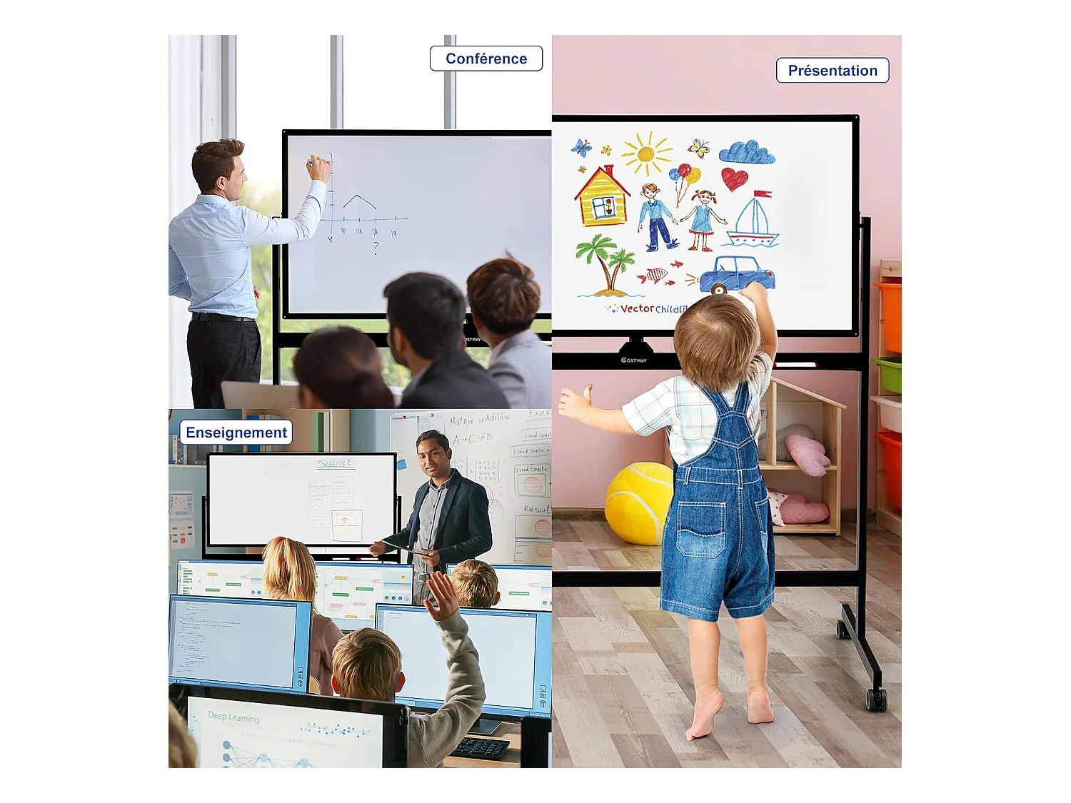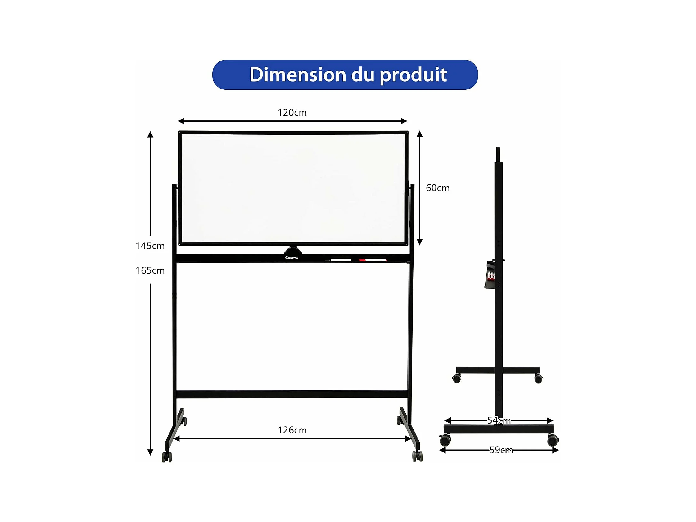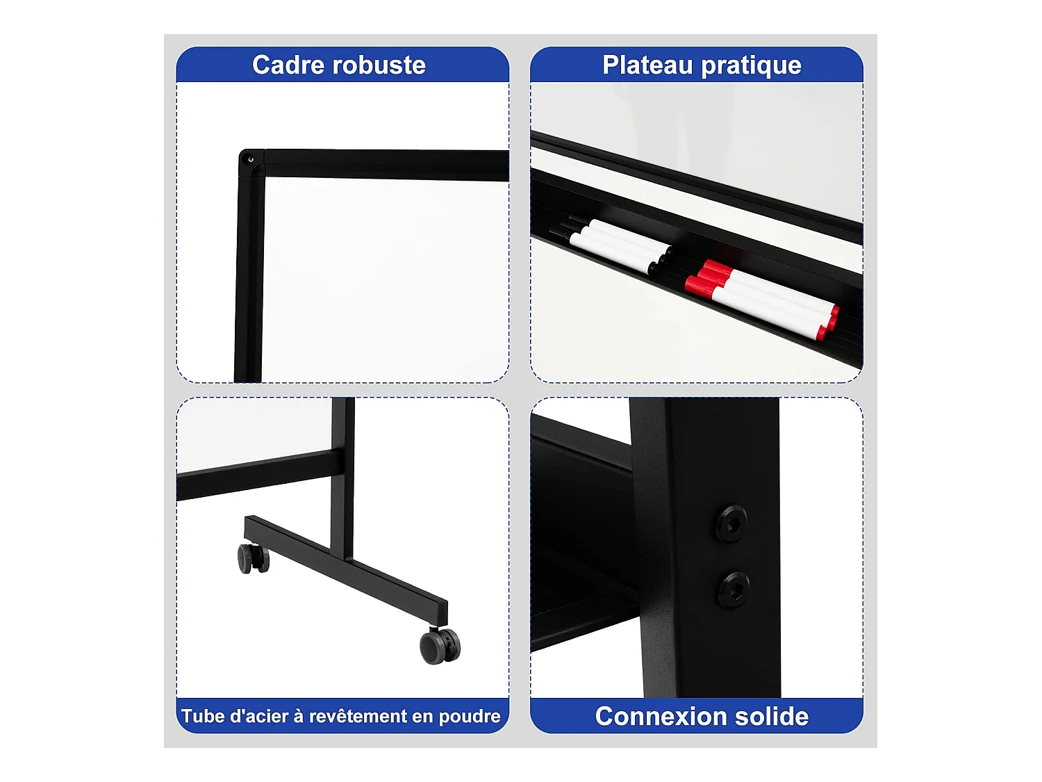 Tableau Blanc Magnétique 120x60cm Double Face Réversible 360° Mobile 2 Hauteur Effaçable à Sec 12 Aimants 6 Marqueurs Noir
