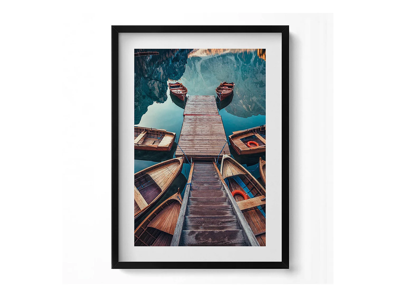 Tableau décoratif avec cadre noir, La jetée et le lac Pragser Wildsee 50 x 70 cm– Parfait pour le salon ou la chambre