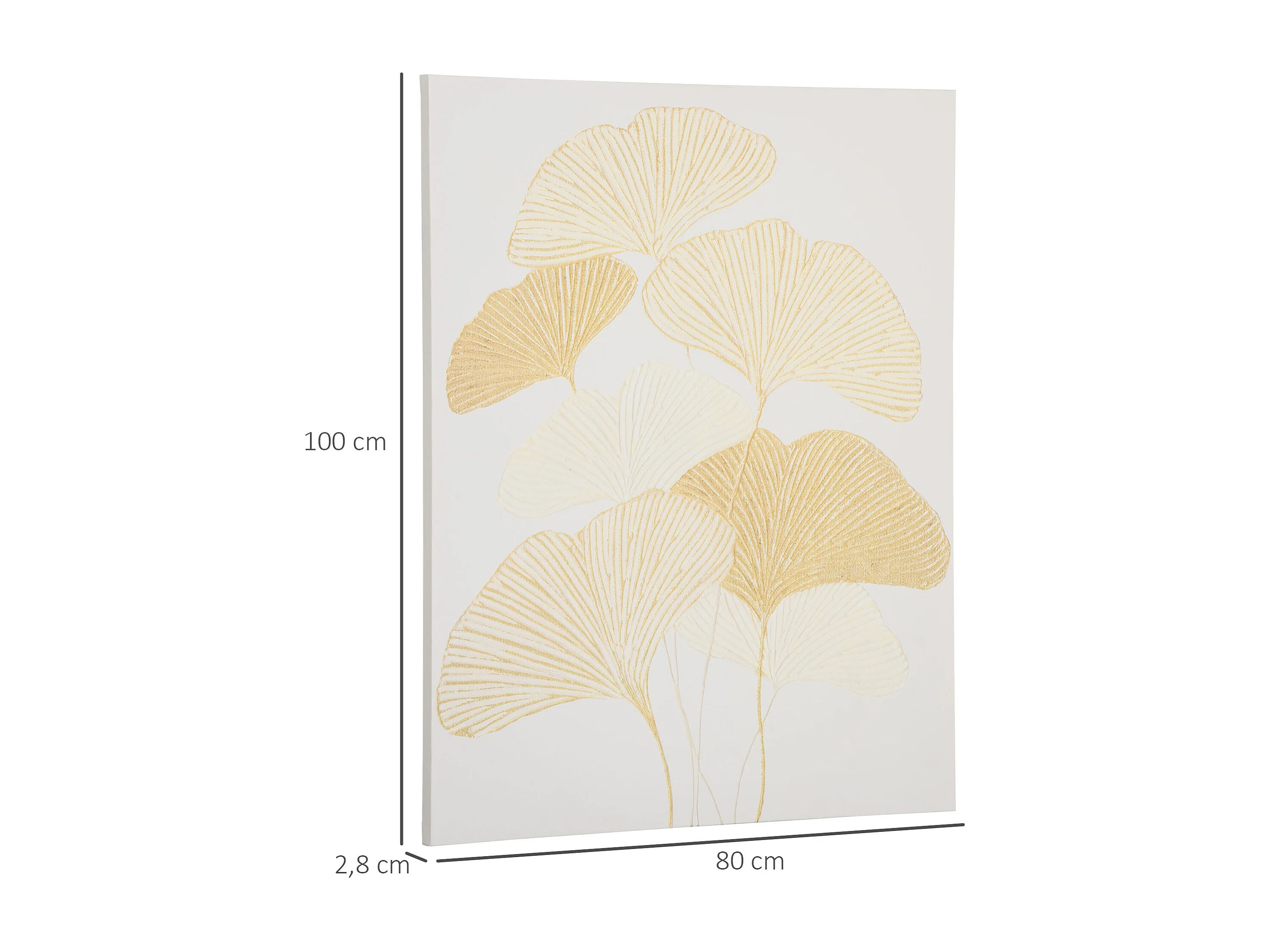 Tableau imprimé et peint feuilles ginkgo biloba - dim. 100L x 80l cm - décoration murale - toile 100% polyester structure bois de pin encre dorée blanc