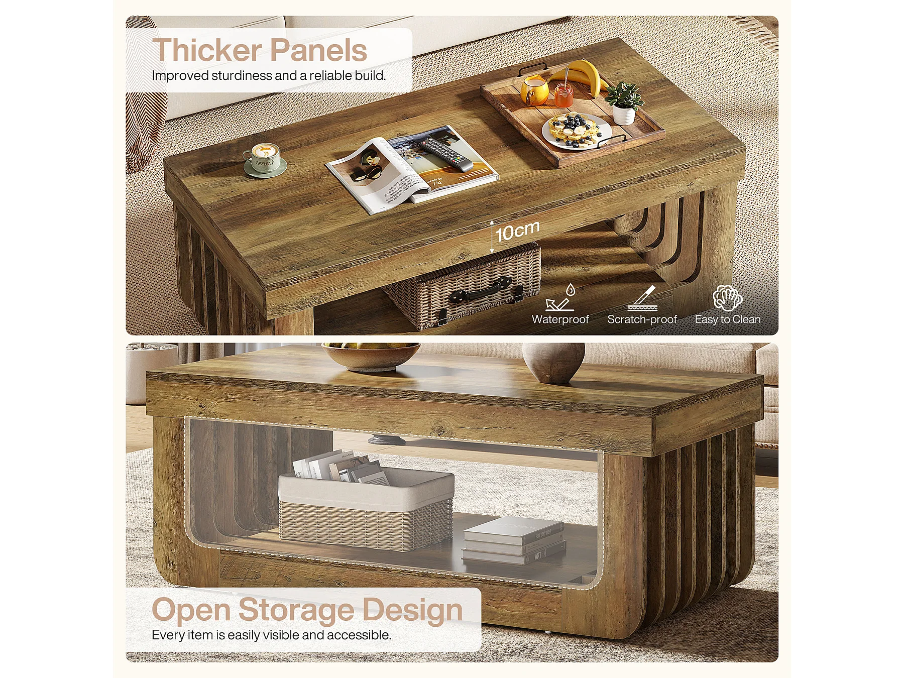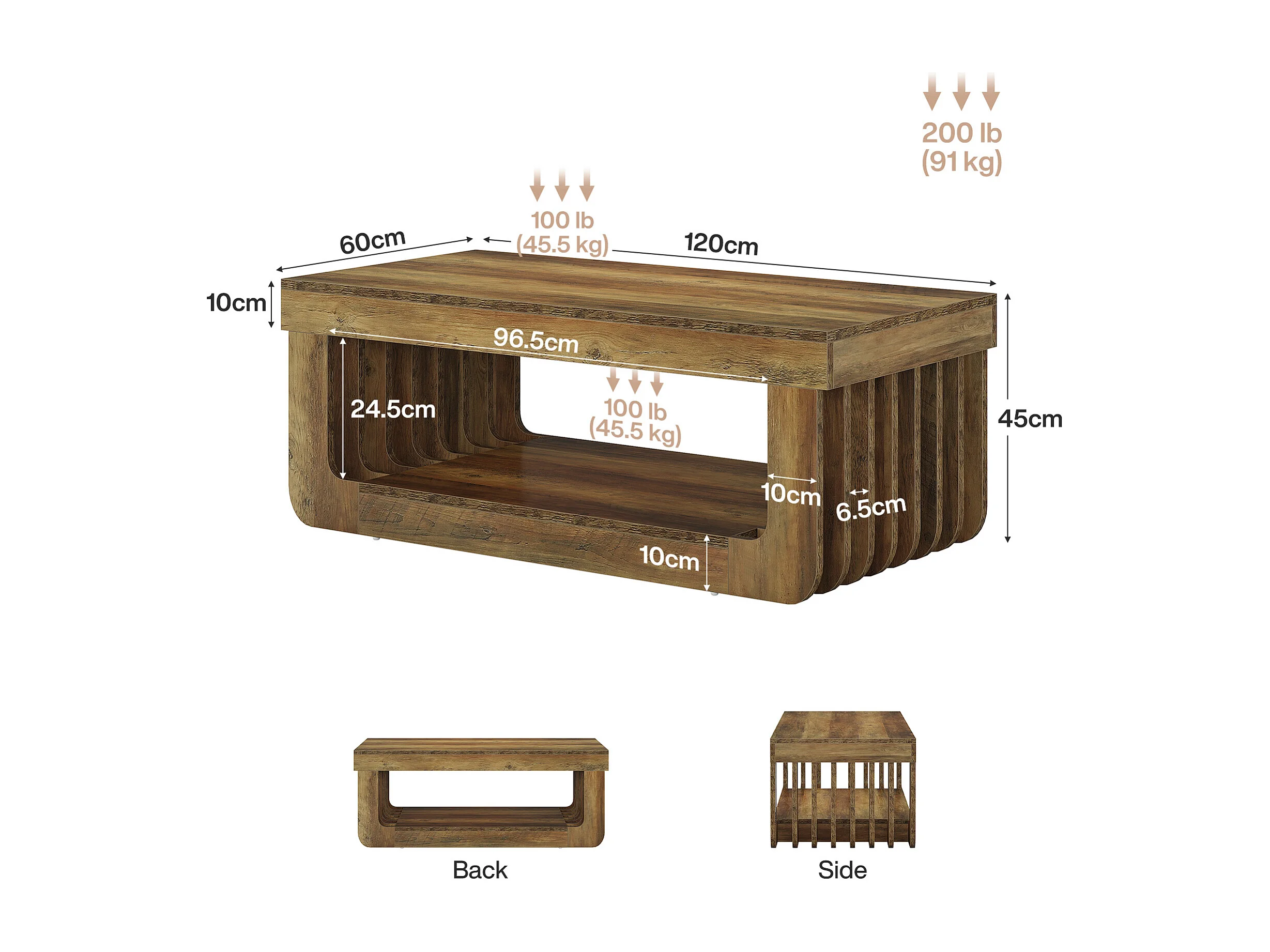 Tables basses de salon, largeur 120 cm, table centrale rectangulaire à 2 niveaux avec étagère de rangement