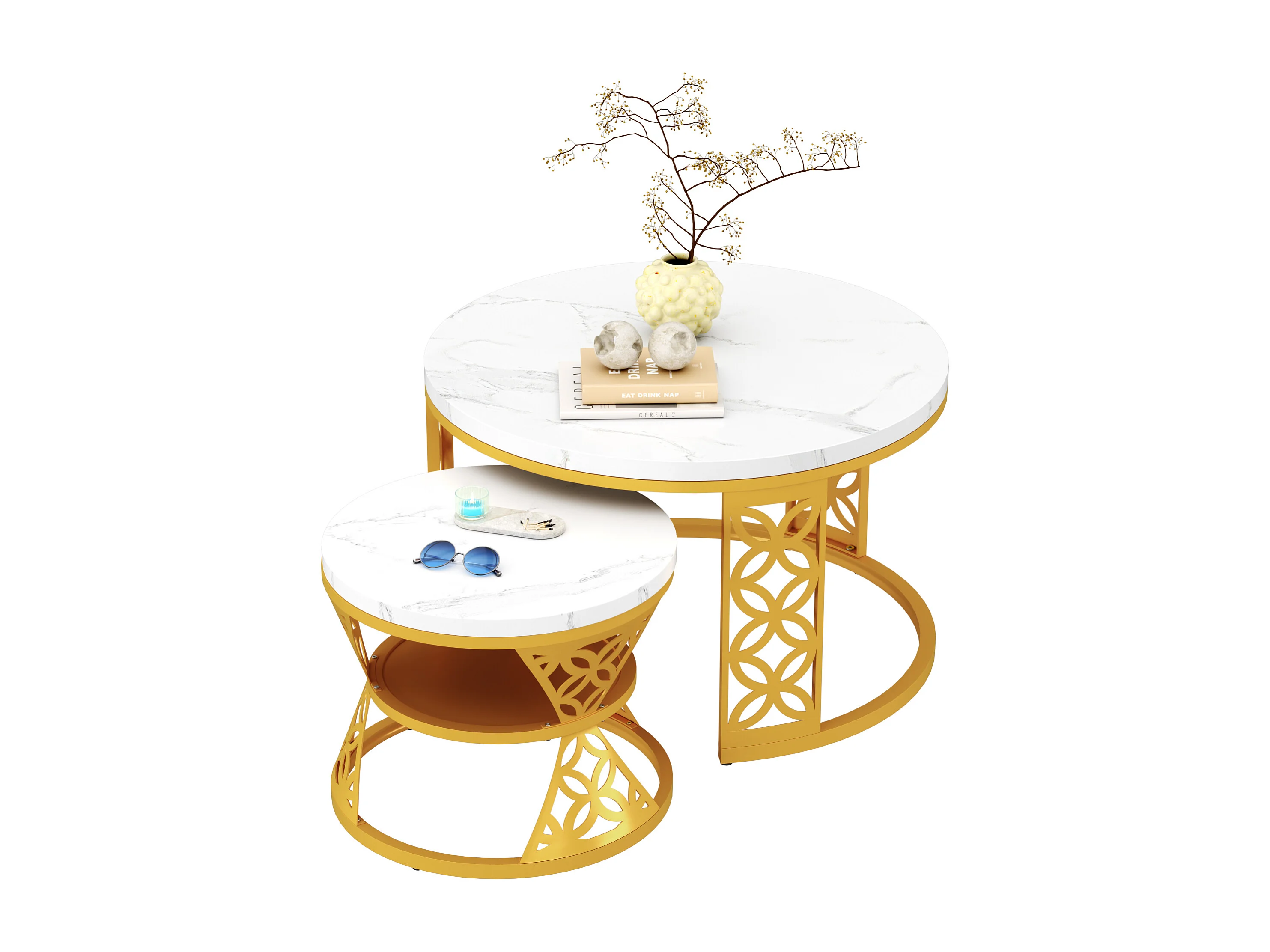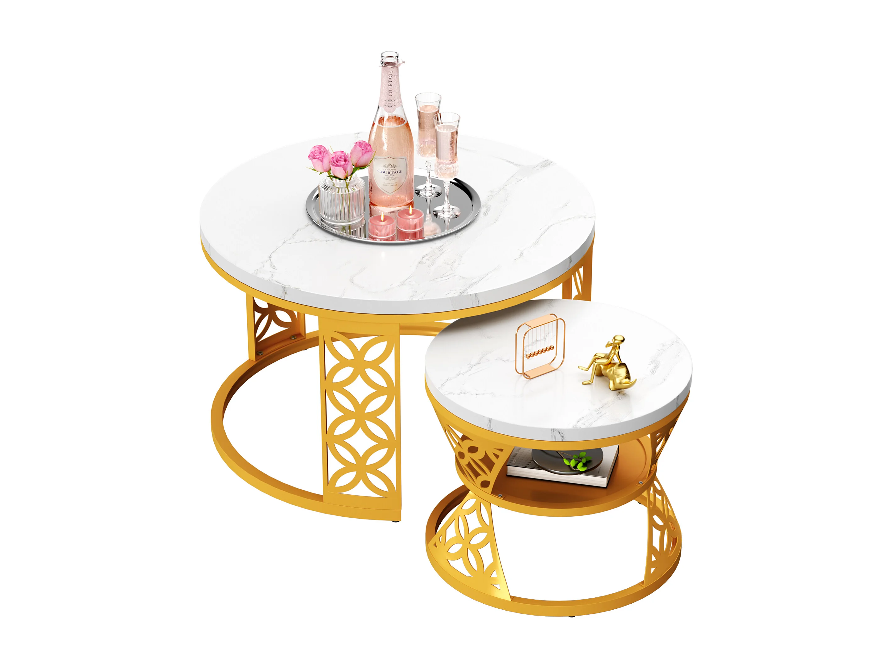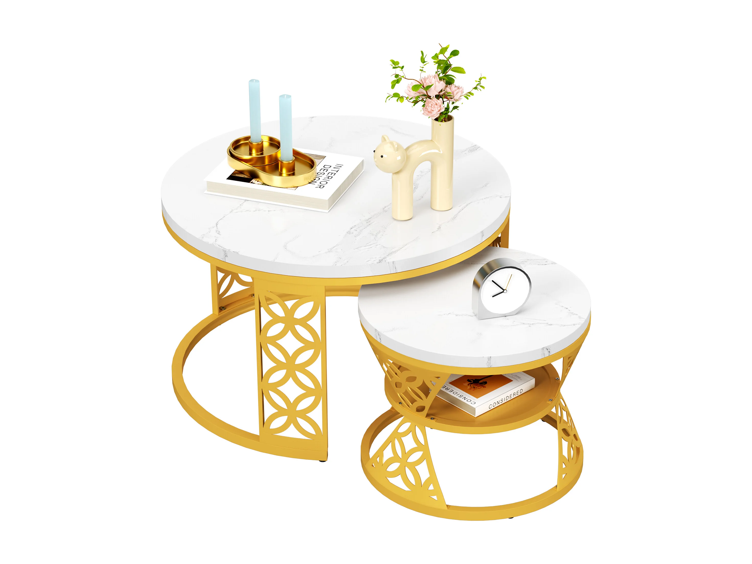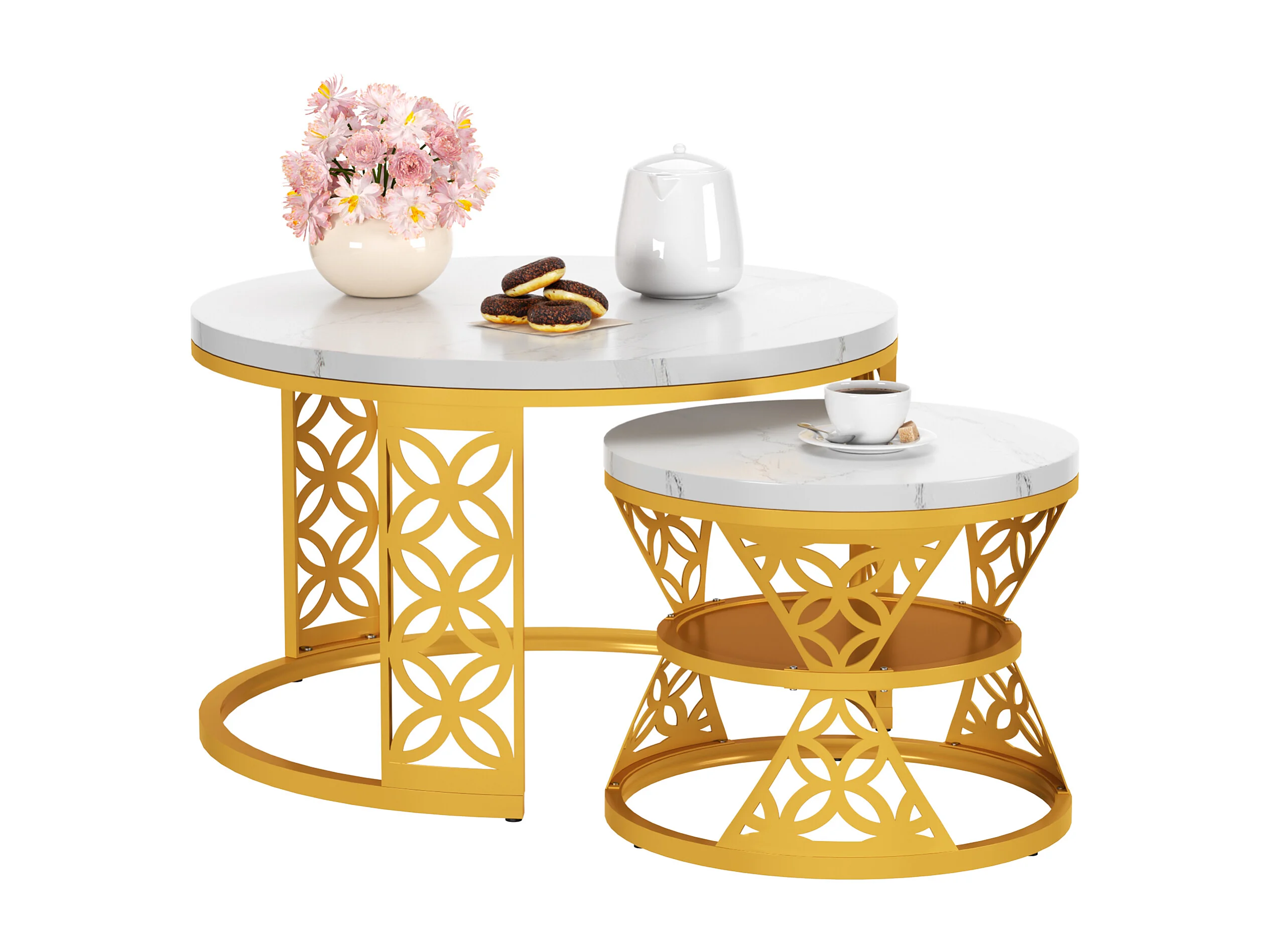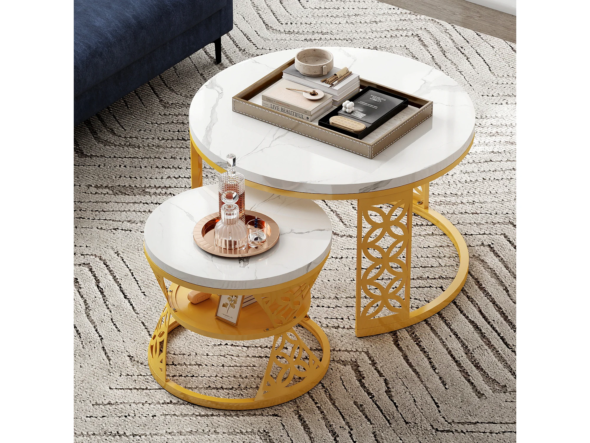 Tables basses gigognes 2 pièces 70×70×45 cm + 45×45×38 cm design contrasté avec placage marbre