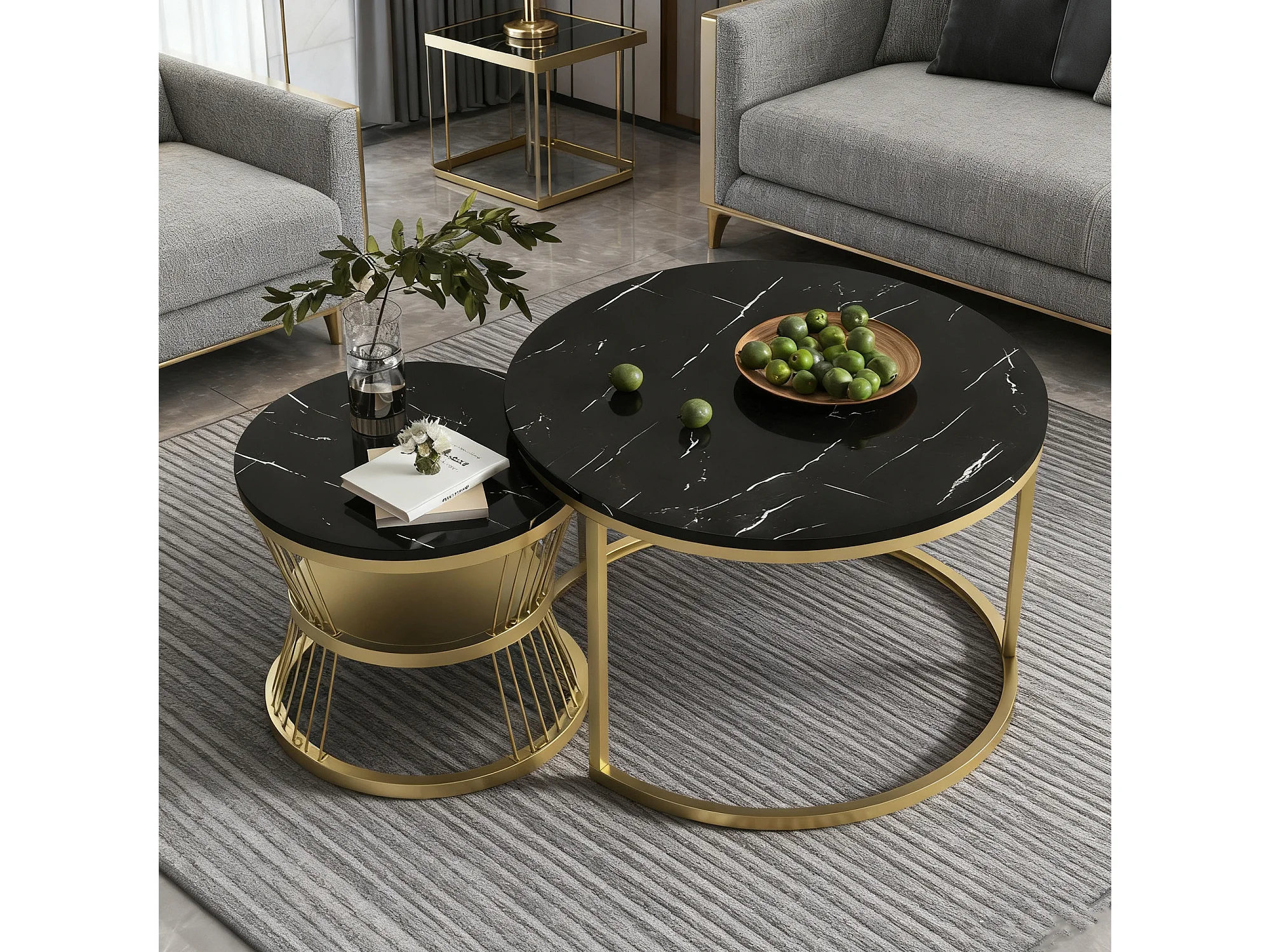 Tables basses gigognes - bois MDF et métal - tables d'appoint rondes - Marbre blanc et métal doré - style industriel