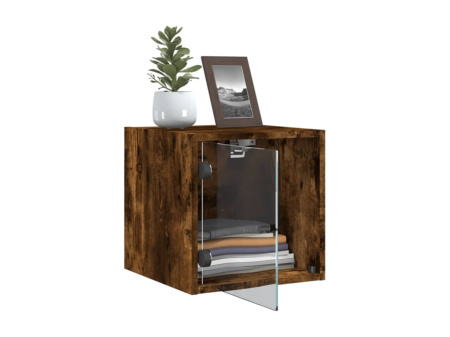 Table de chevet avec porte en verre chêne fumé 35x37x35