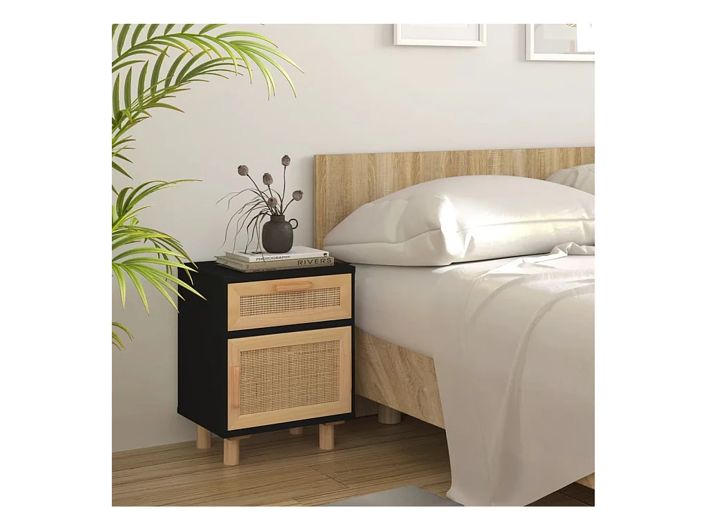 Tables de chevet-Tables d'appoint 2 pcs Noir Bois de pin massif et rotin naturel