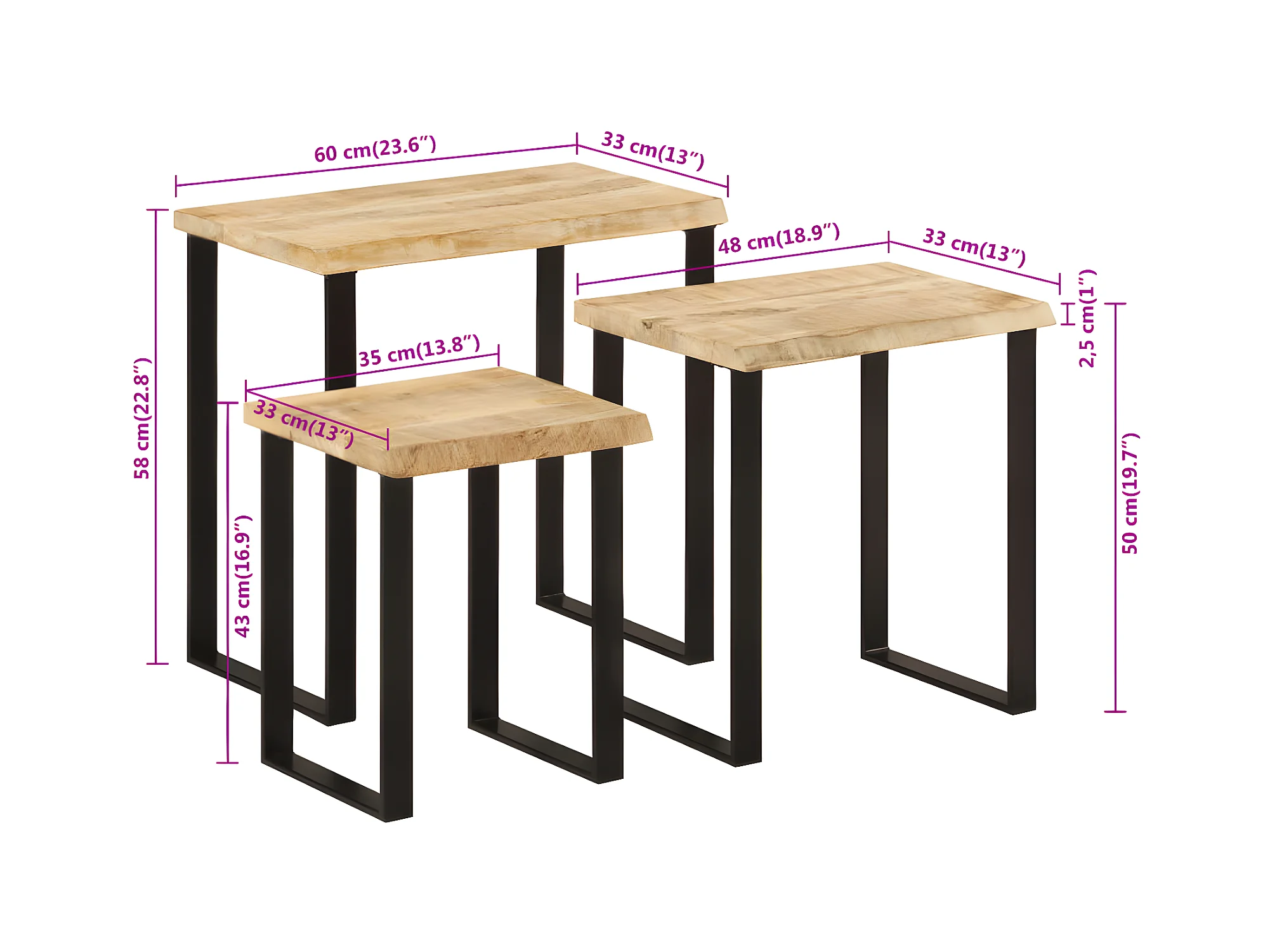 Tables gigognes 3 pcs avec bord vivant bois de manguier massif