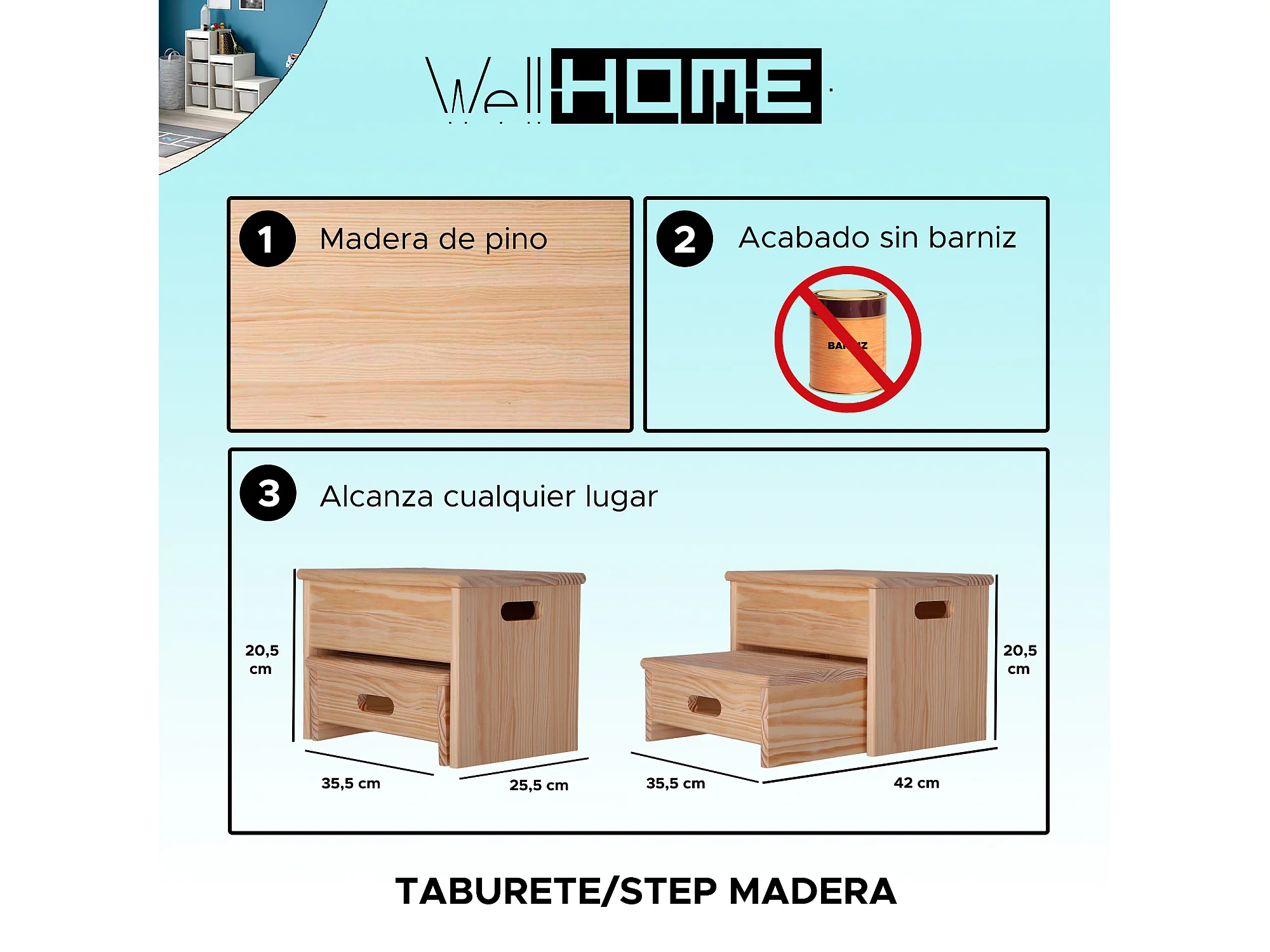 Tabouret à 2 marches, finition SANS vernis, 35x25x20 cm