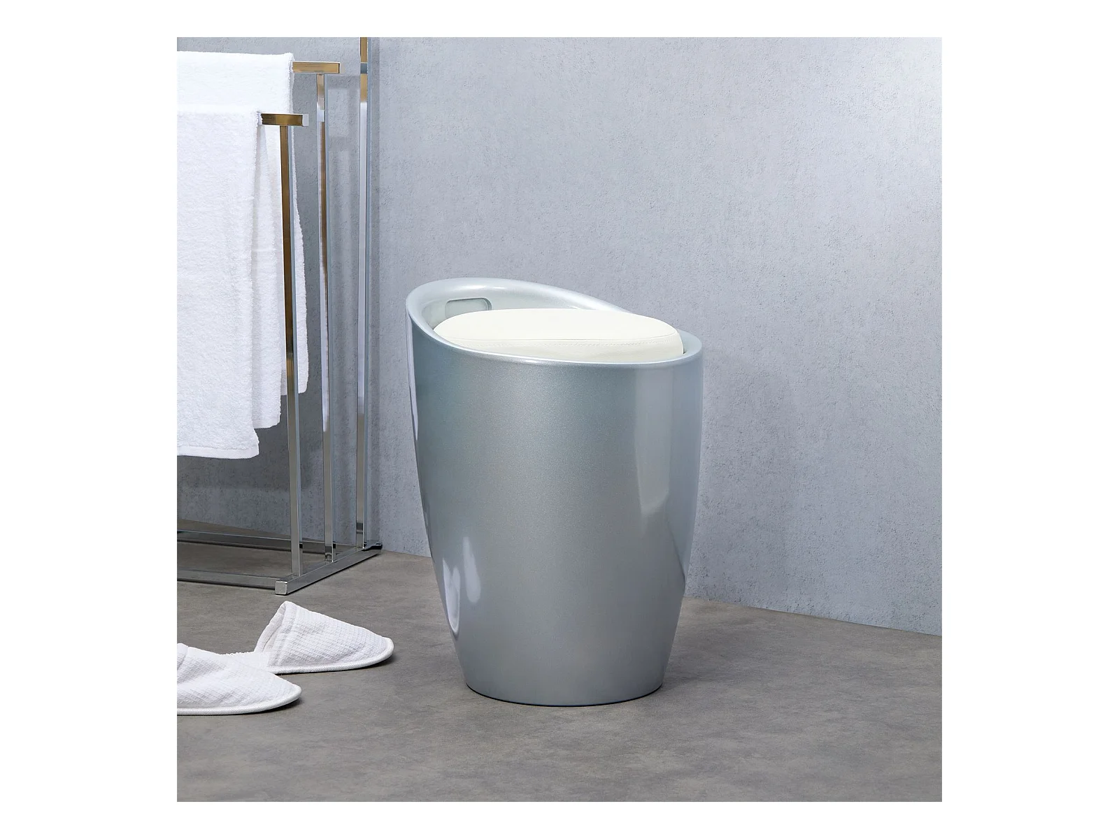 Tabouret DANIEL pouf rond coffre de rangement panier à linge siège avec assise rembourrée blanc, structure en plastique gris