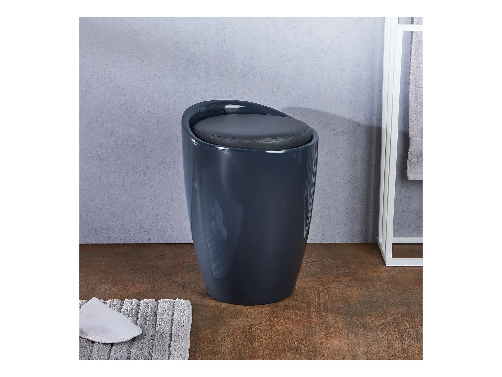 Tabouret DANIEL pouf rond coffre de rangement panier à linge siège avec assise rembourrée gris, structure en plastique gris