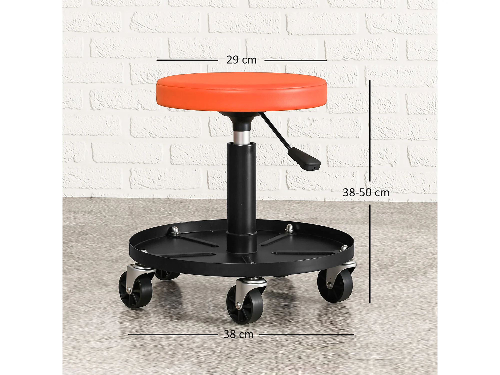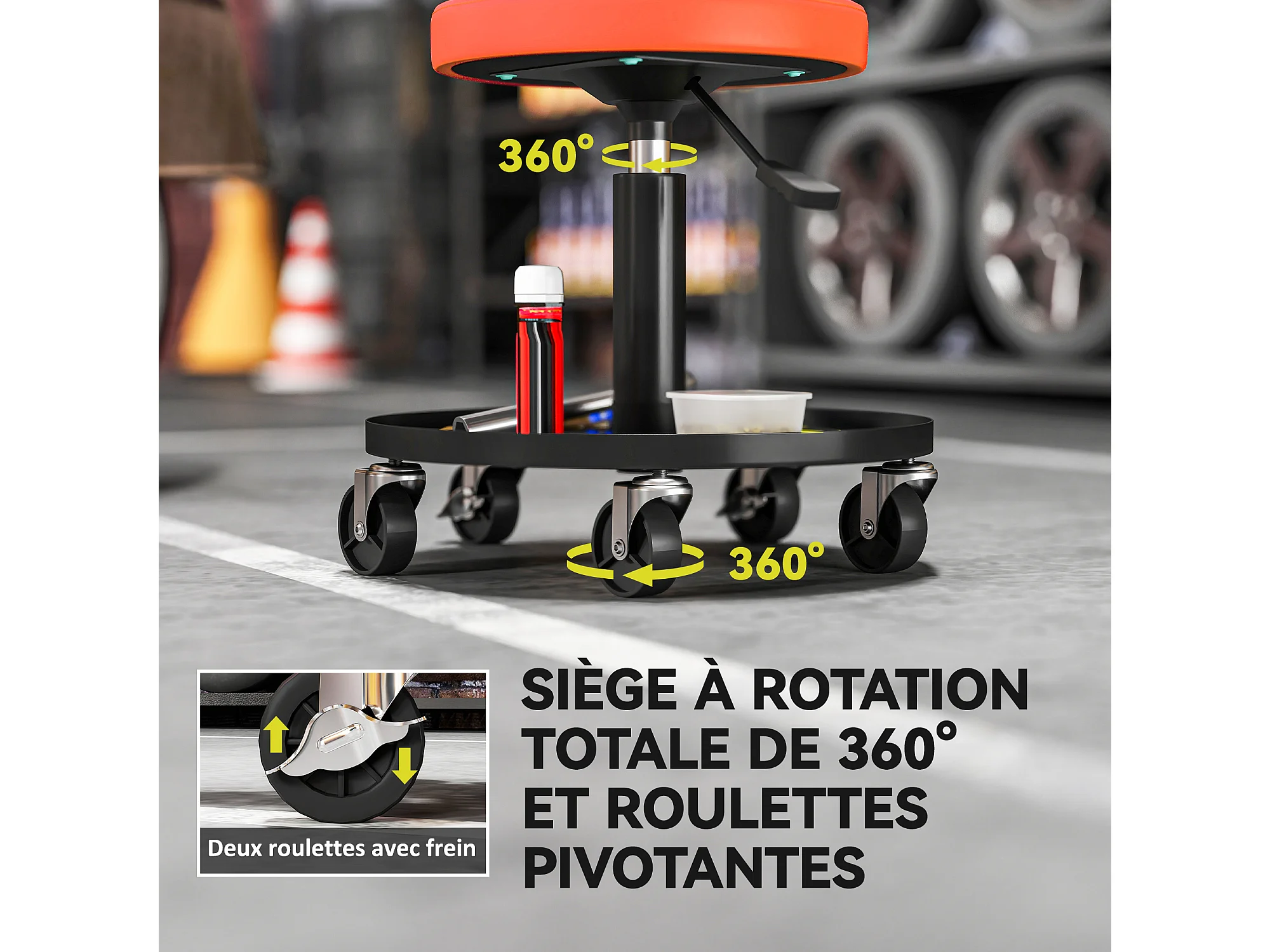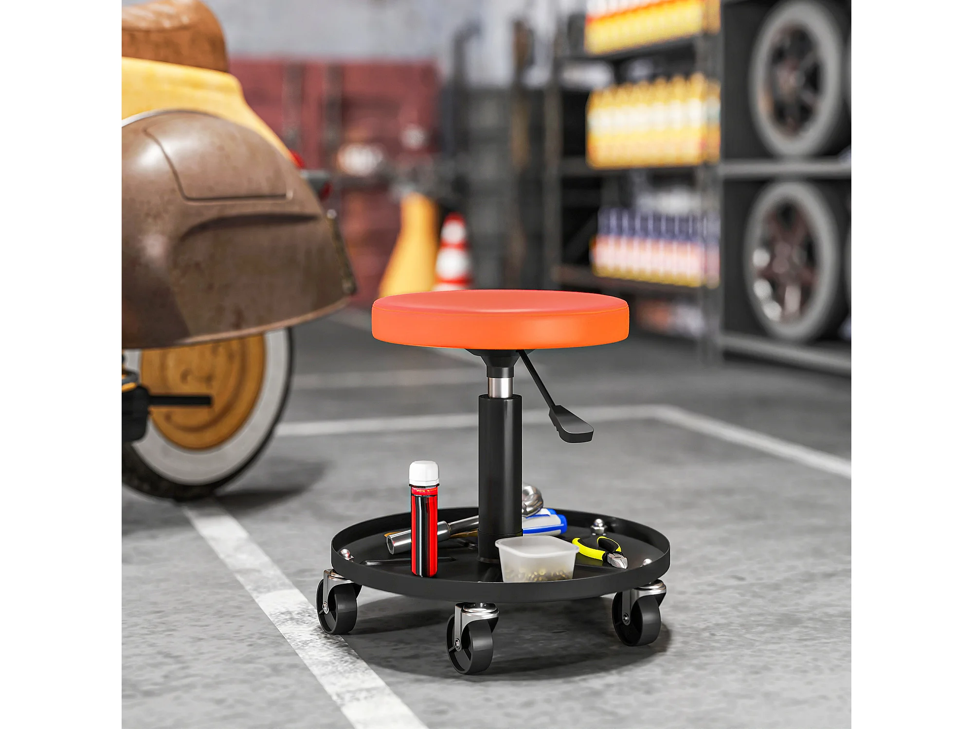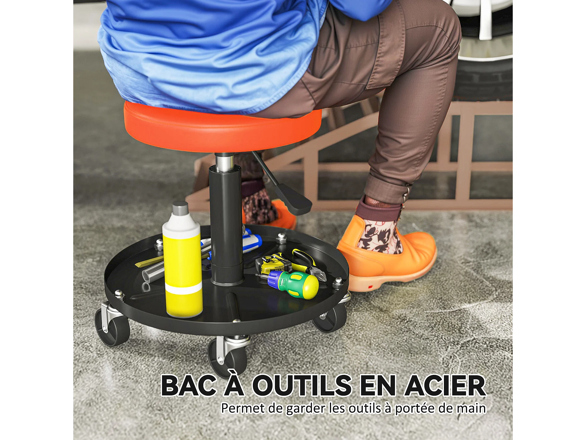 Tabouret d'atelier mobile - tabouret de mécanicien - pivotant réglable H.38-50 cm, plateau outils - orange