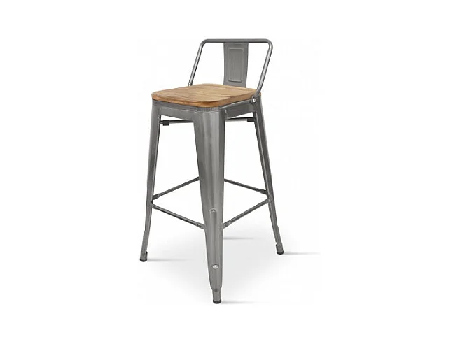 Tabouret de bar en métal brut aspect galvanisé style industriel avec dossier et assise en bois clair - Hauteur 66 cm