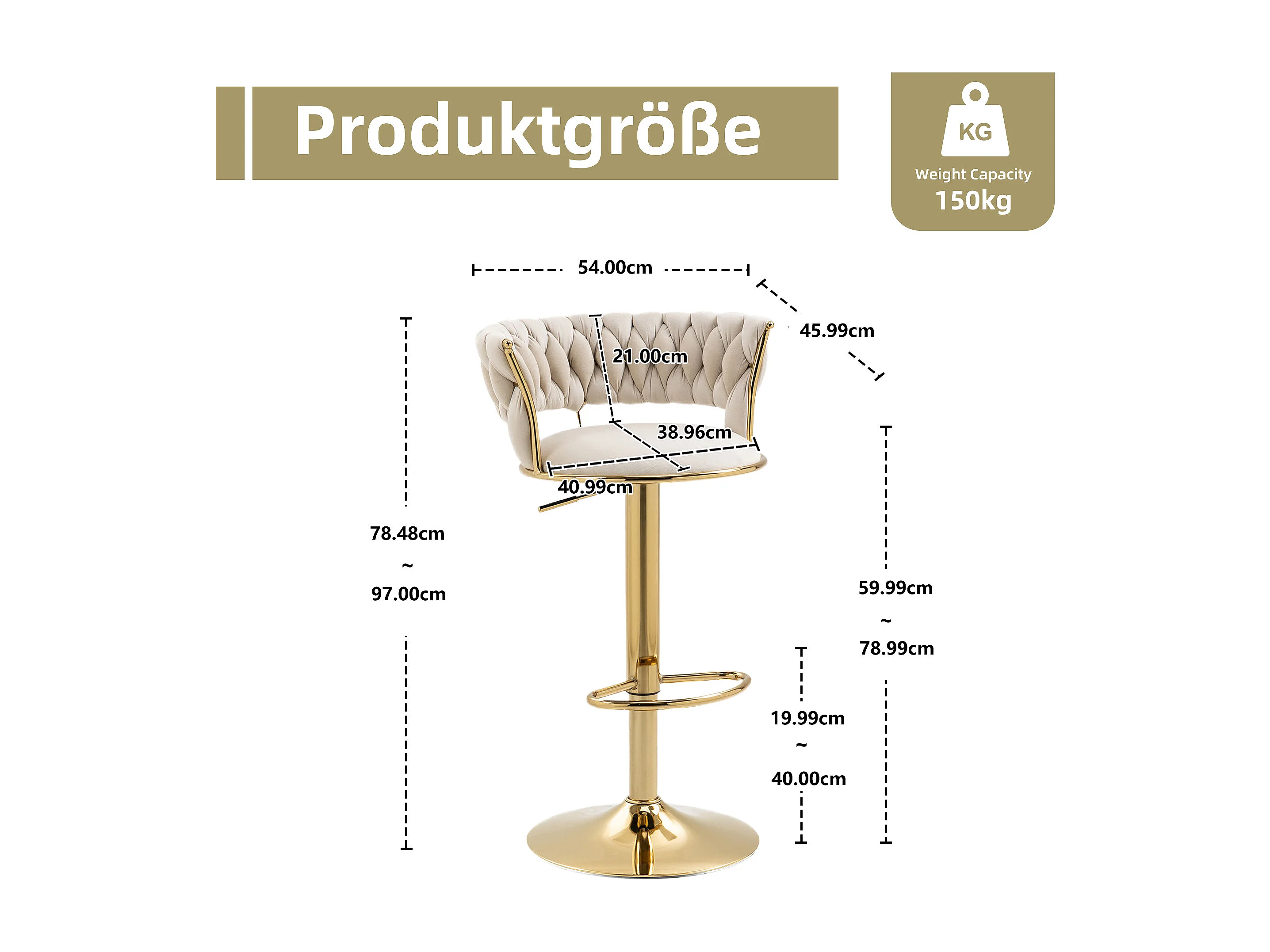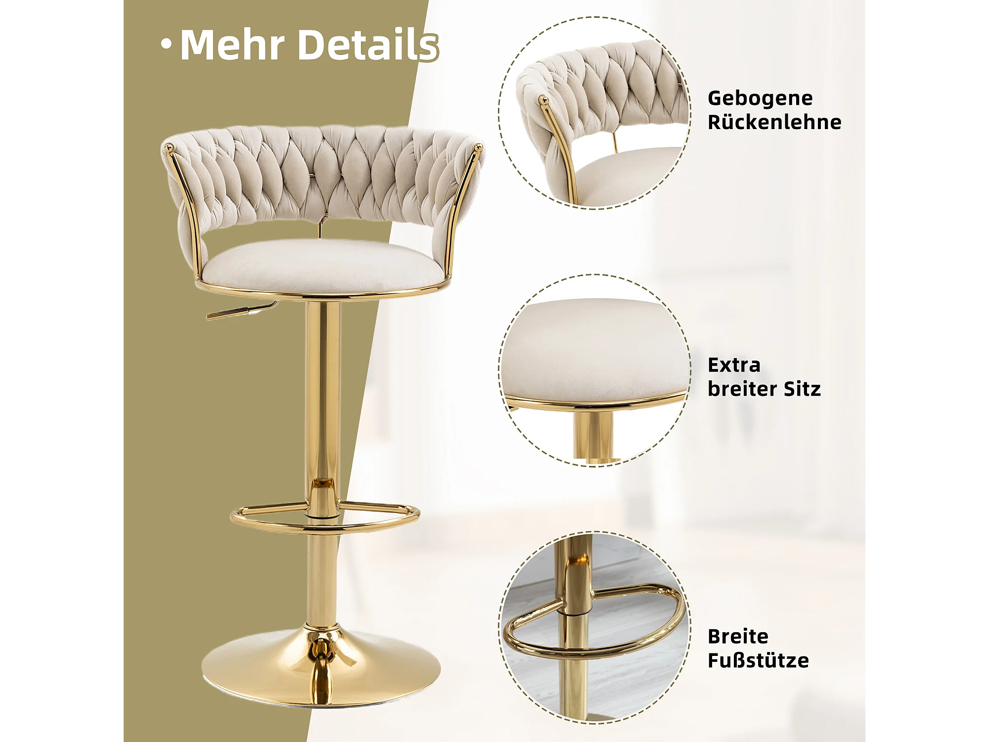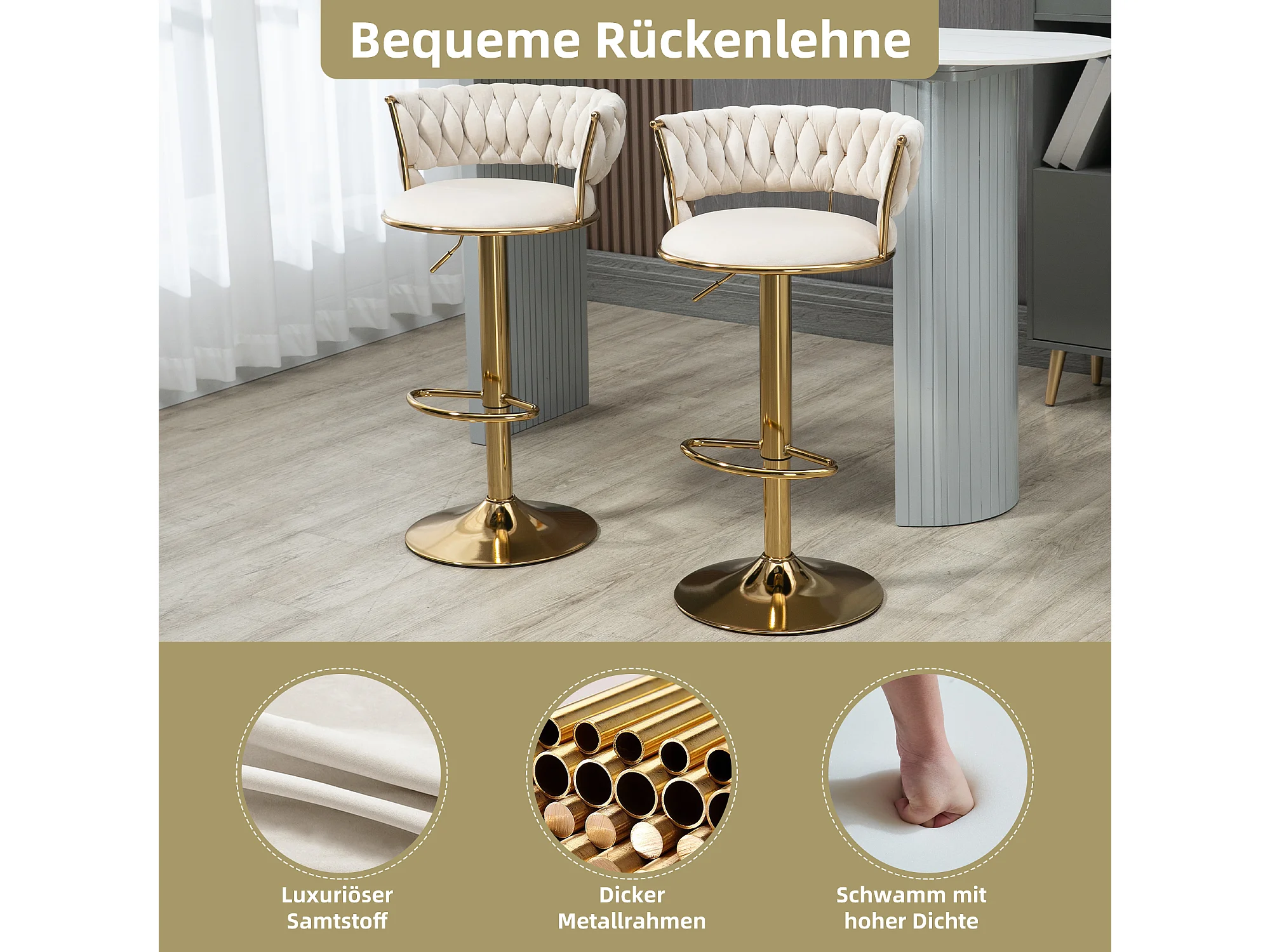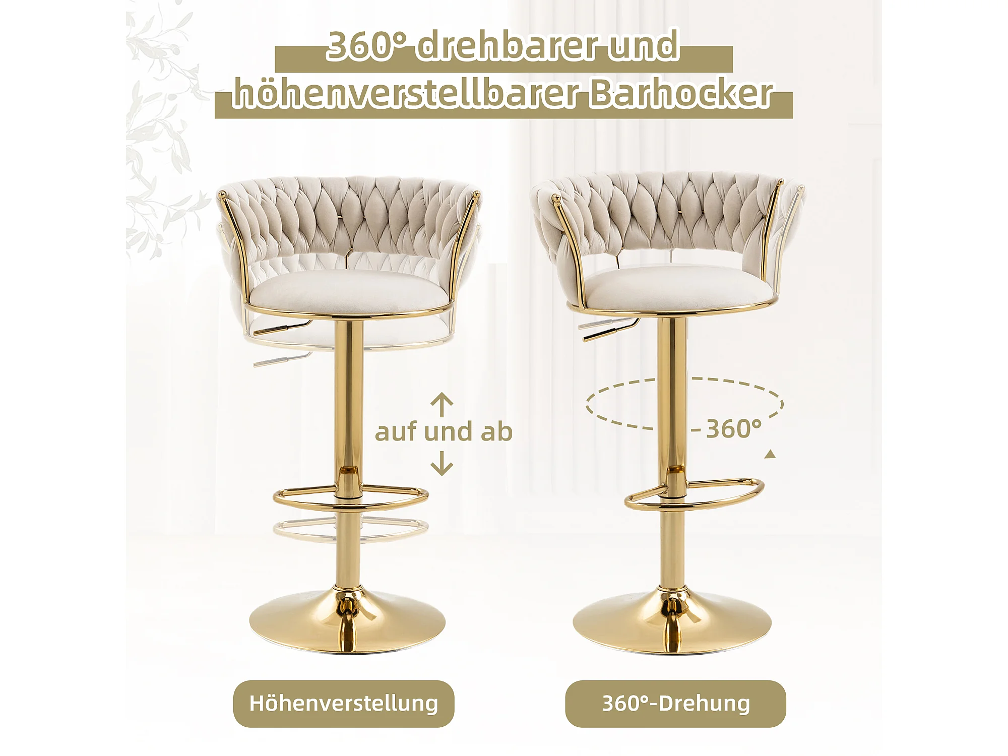 Tabouret de Bar en Velours 360° Pivotant, Set de 2 avec Dossier Tissé à Main et Hauteur Réglable, Confort Ergonomique pour Cuisine et Salle à Manger
