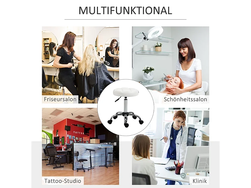 Tabouret roulant, hauteur réglable, en simili cuir, blanc (Ø35.5x51-67 cm)