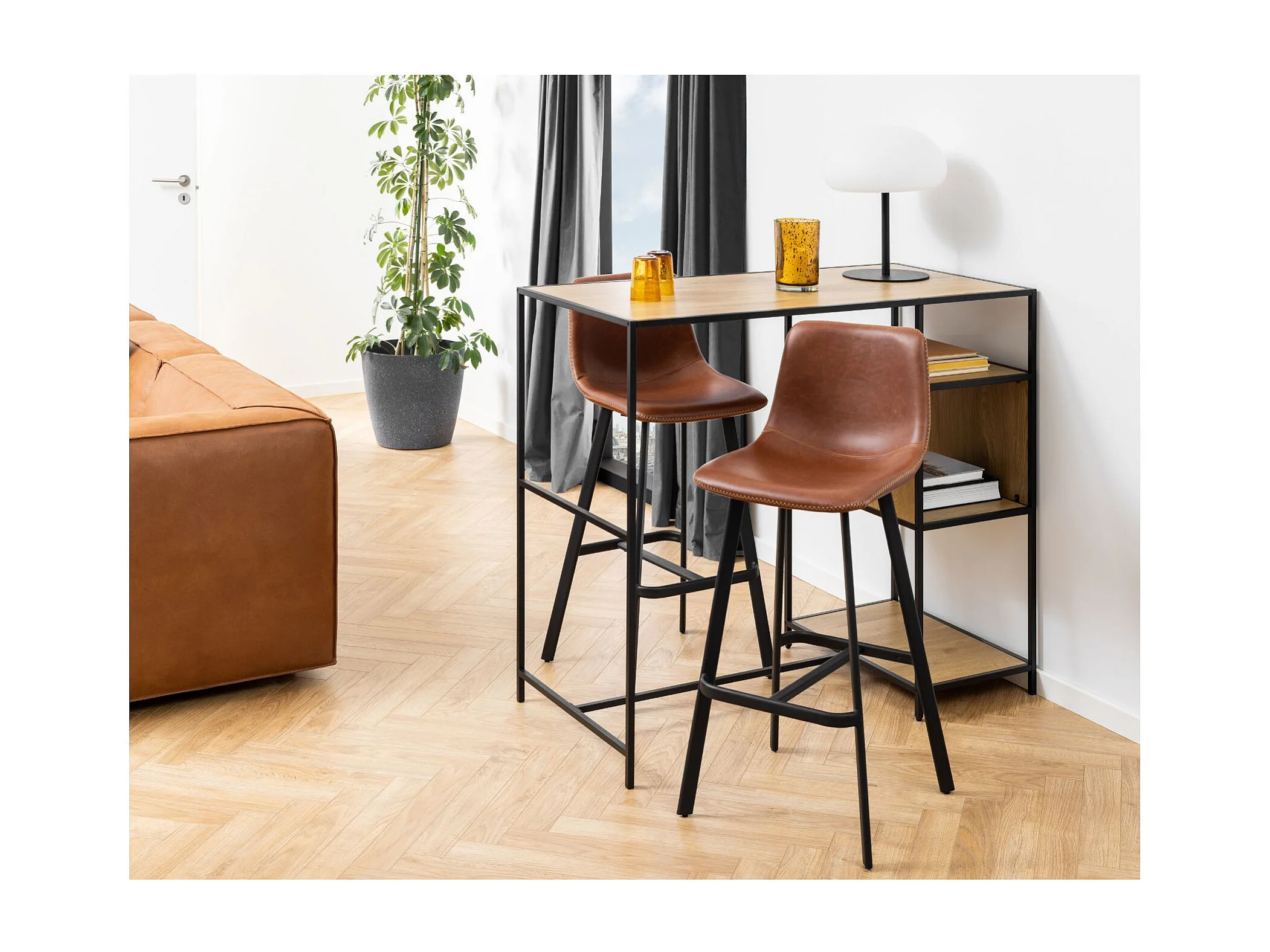 Tabourets de bar simili marron pieds métal noir (lot de 2) - NIELS
