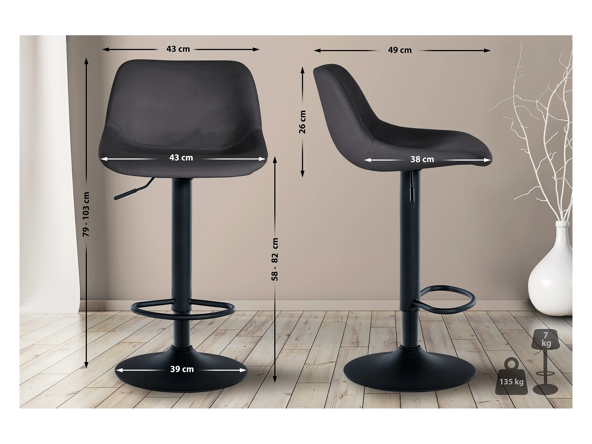 Tabouret de bar - Velours & Noir - Gris foncé - Toni