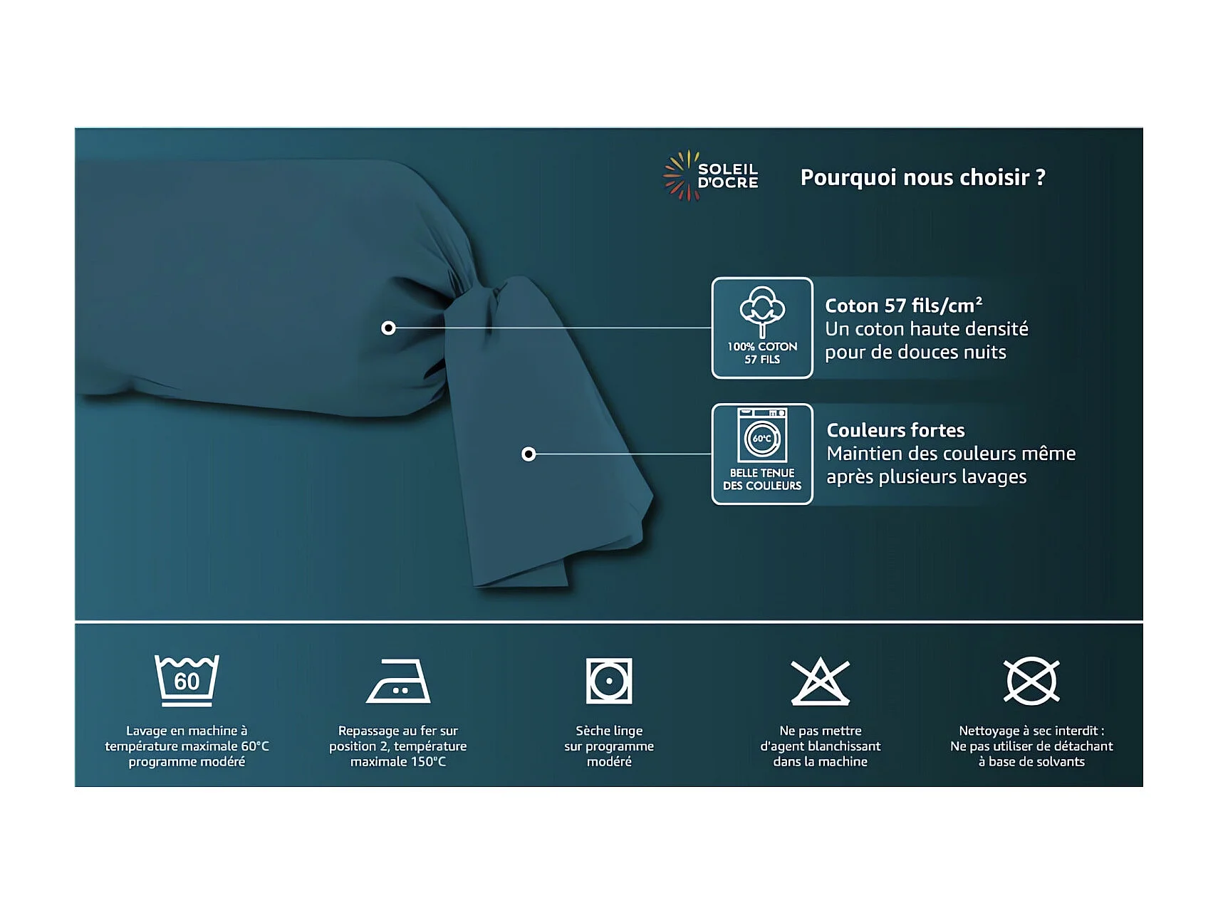 Taie de traversin en coton 57 fils 45x185 cm UNI bleu canard, par Soleil d'ocre