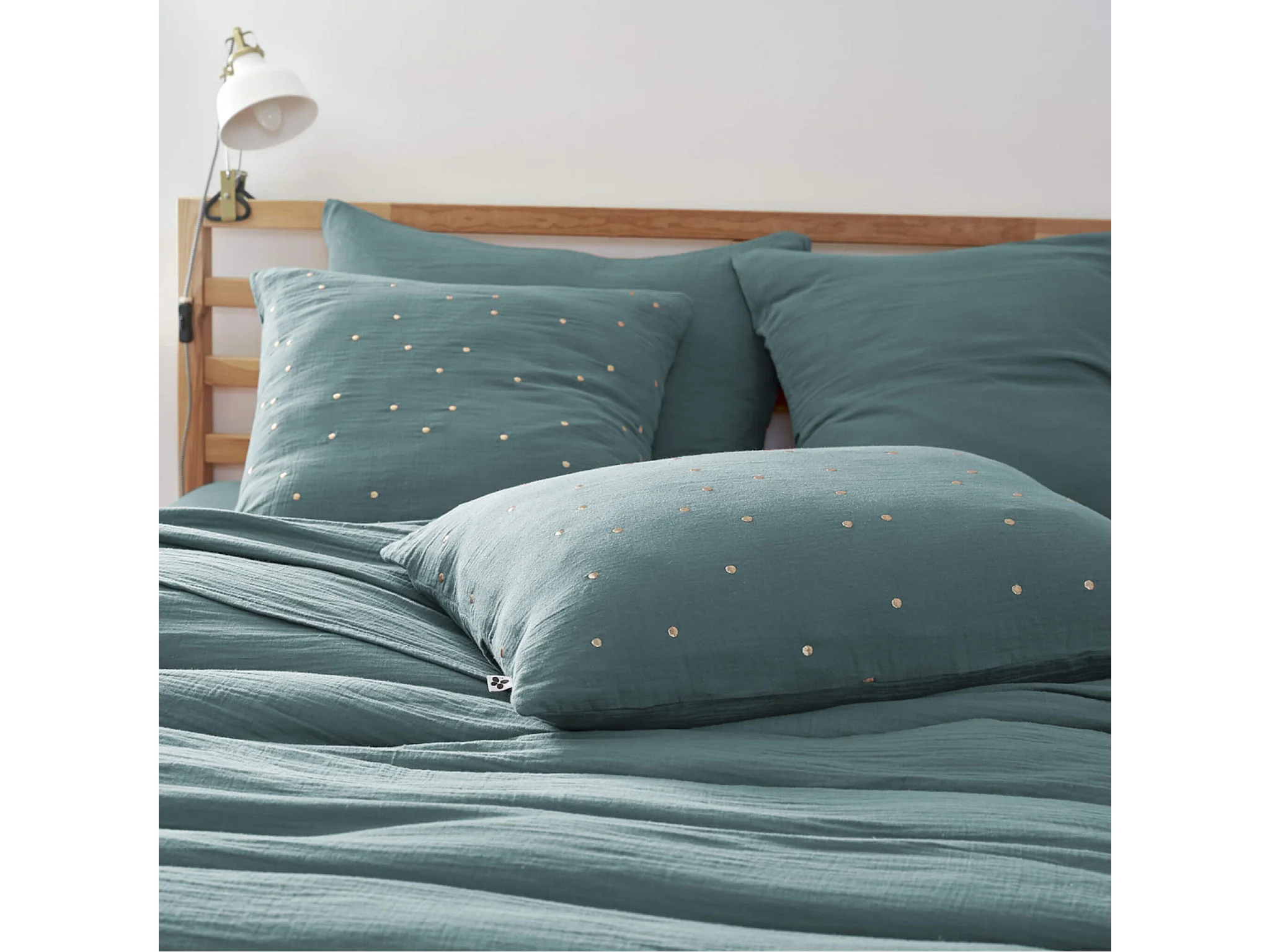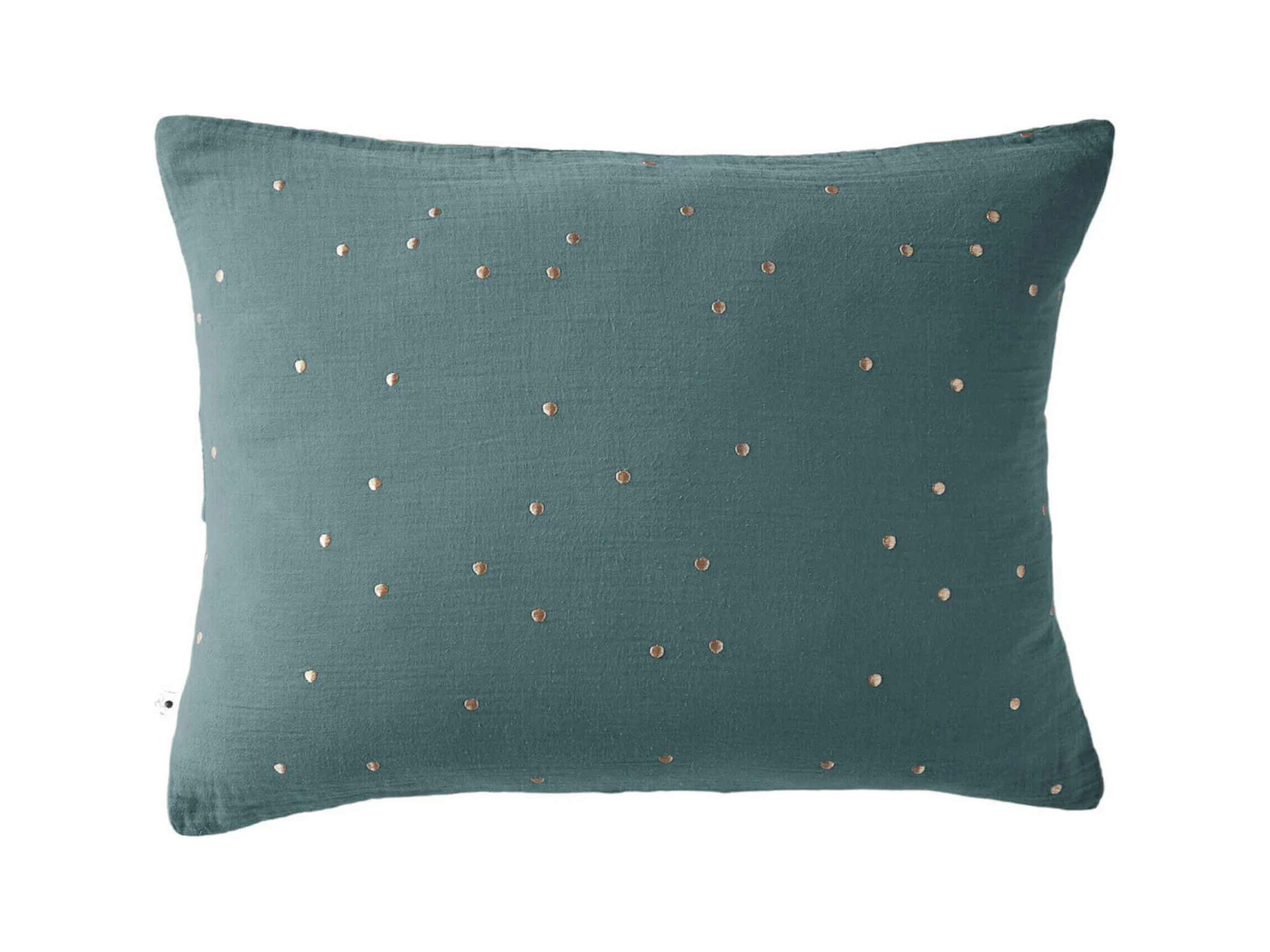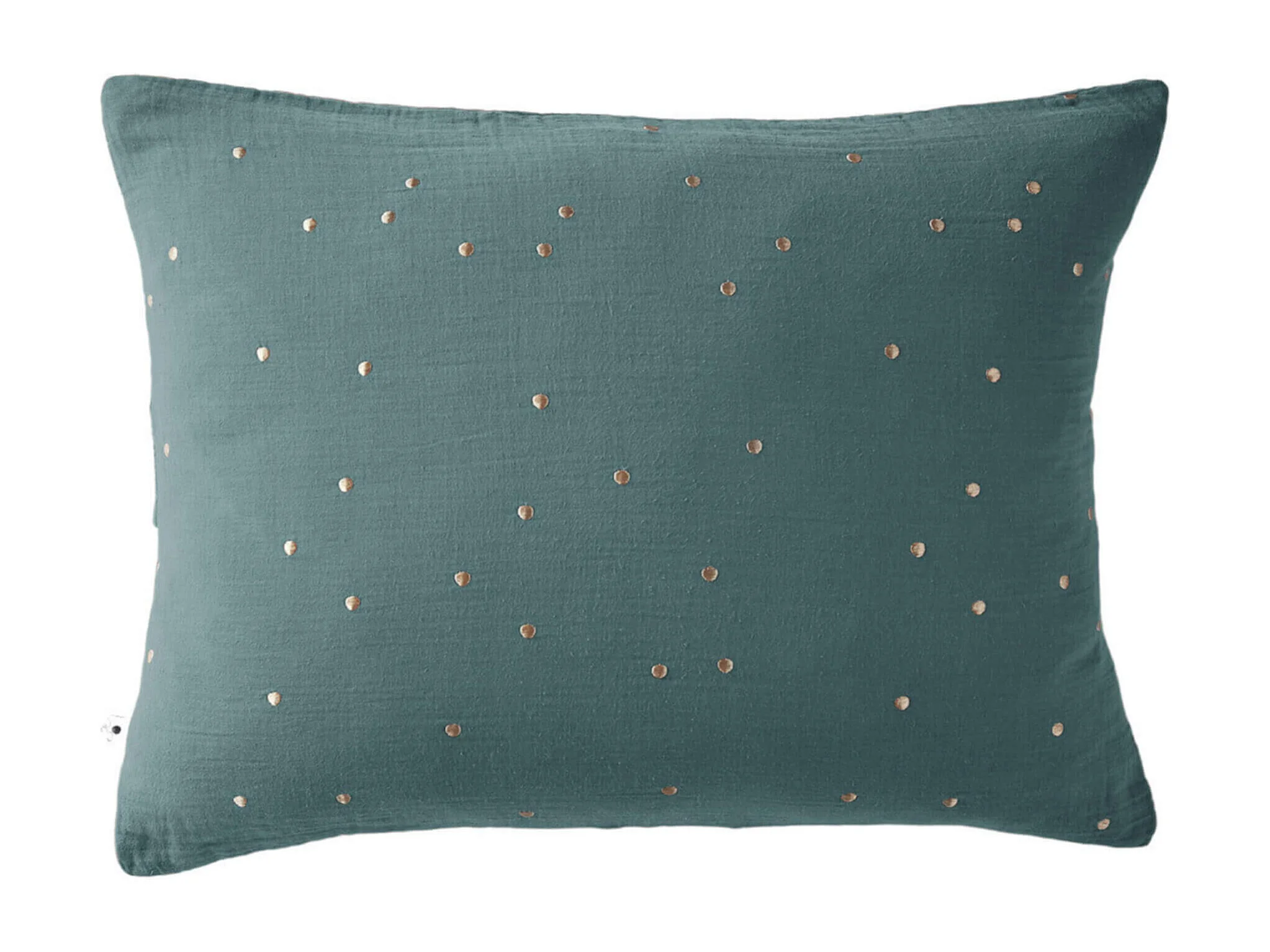Taie d'oreiller à pois brodés double gaze de coton bleu canard 60x60 cm