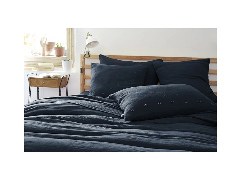 Lot de 2 taies d'oreillers brodées double gaze de coton marine 60x60