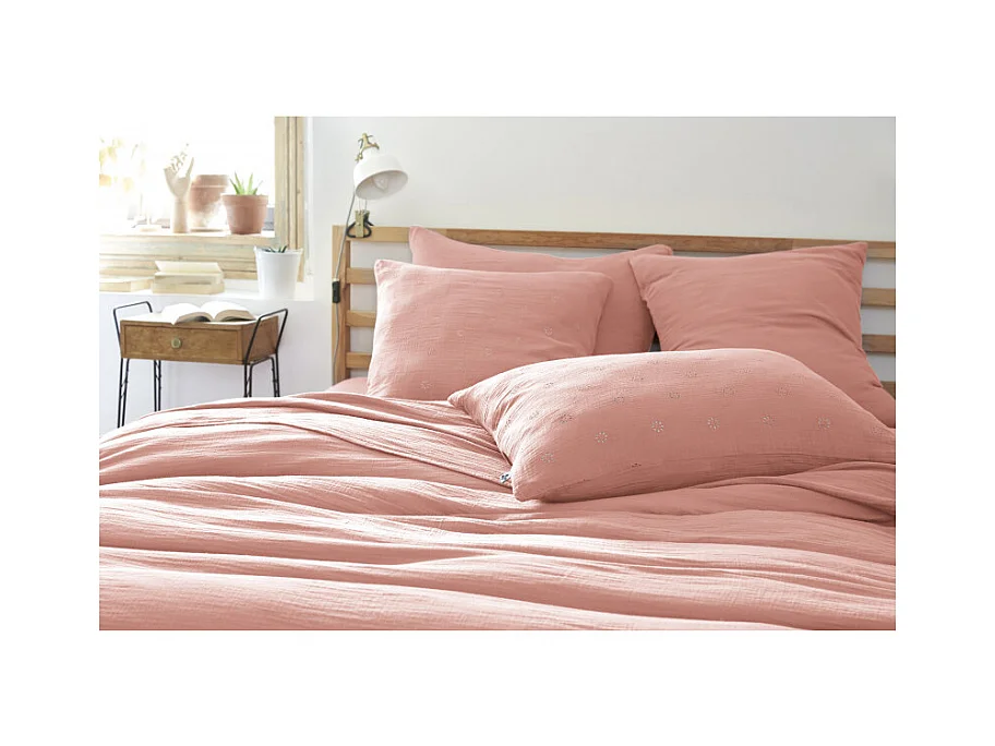 Taie d'oreiller brodée double gaze de coton rose 50x70 cm
