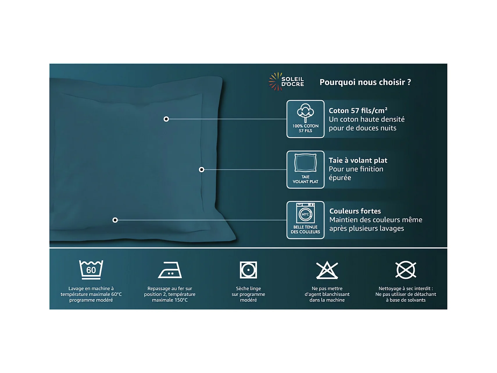 Taie d'oreiller en coton 57 fils 63x63 cm UNI noir, par Soleil d'ocre