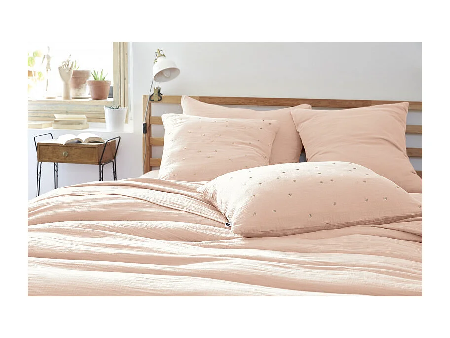 Taie d'oreiller brodée double gaze de coton rose 60x60 cm