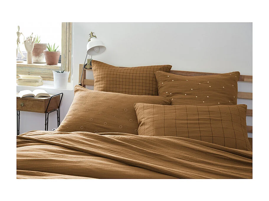 Taie d'oreiller brodée double gaze de coton marron 50x70 cm