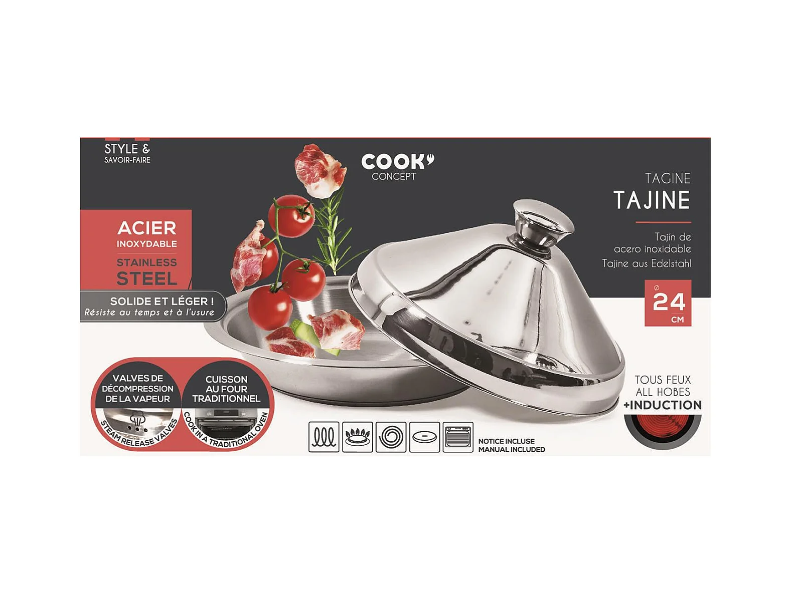 Tajine en acier inoxydable 24cm Compatible Tous Feux (Induction) et four