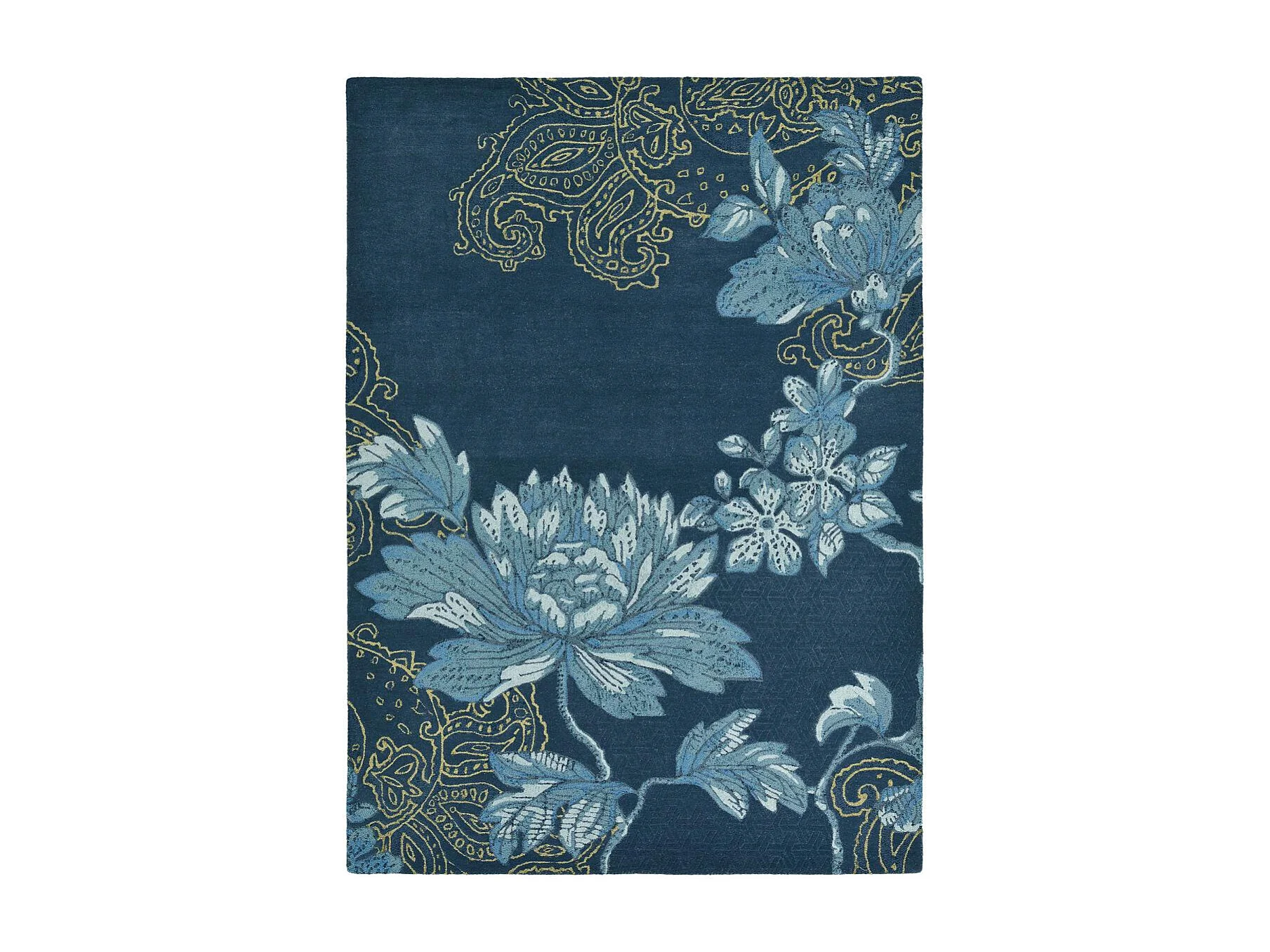 tapis chambre 120x180 fait à la main en laine bleu marine et bleu motif floral
