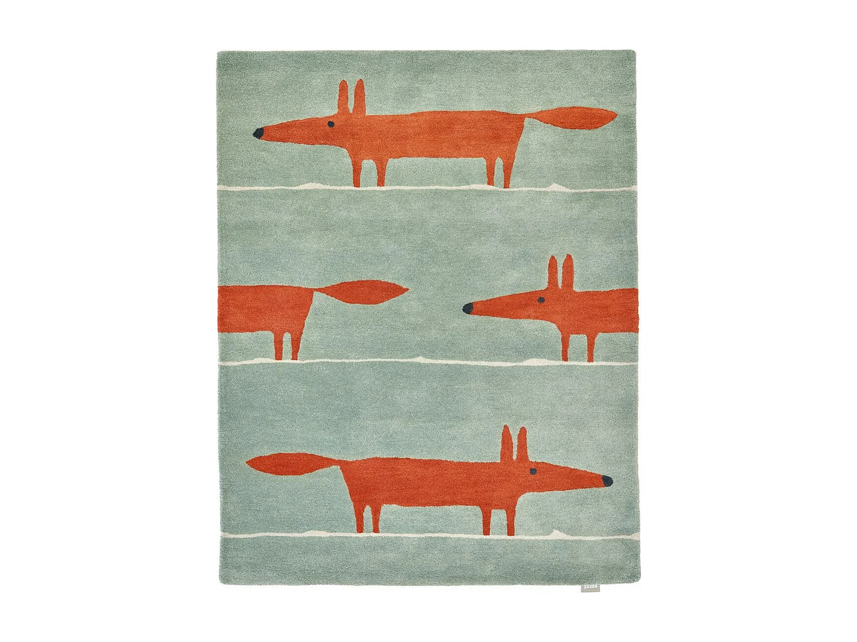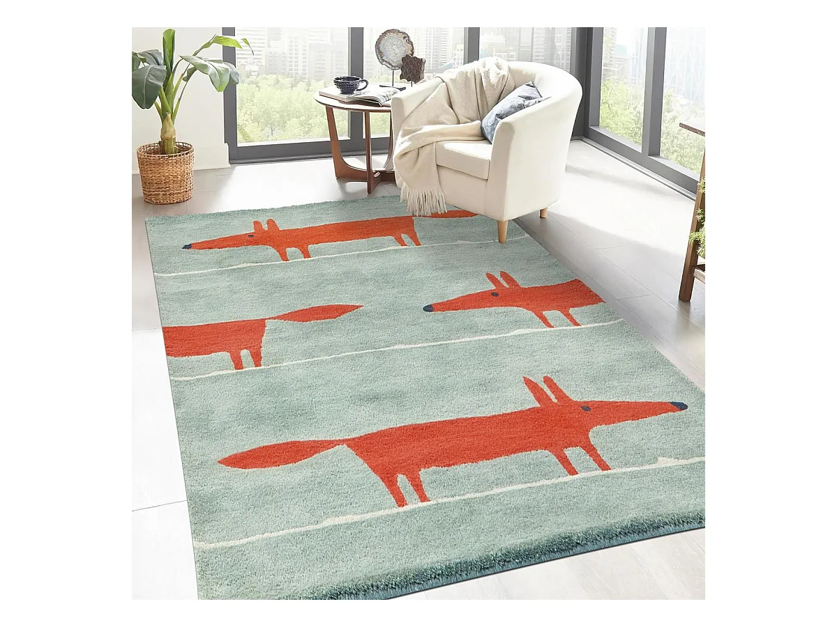 Tapis enfant 120x180 fait à la main en laine vert pastel et rouge MR FOX