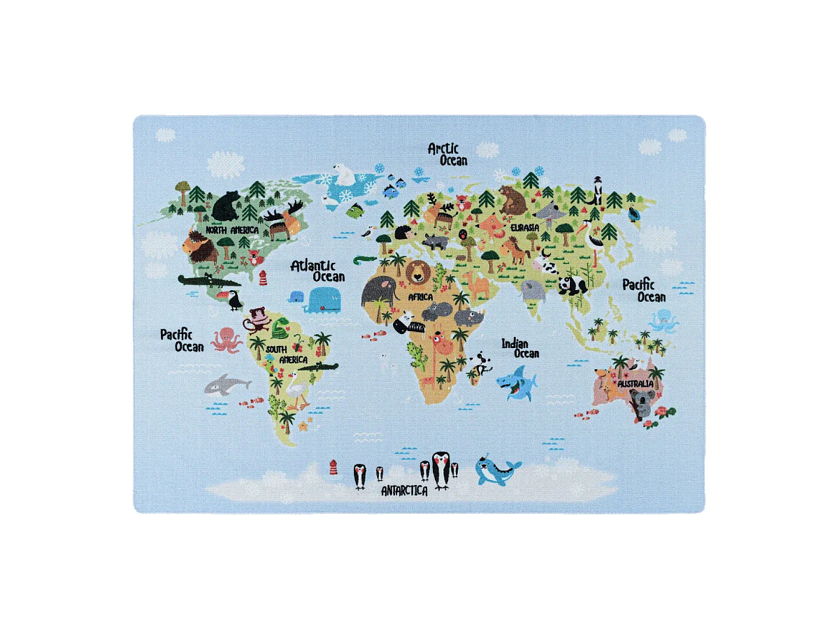 Tapis enfant 80x150 rectangle tissé bleu et crème motif animaux DINO