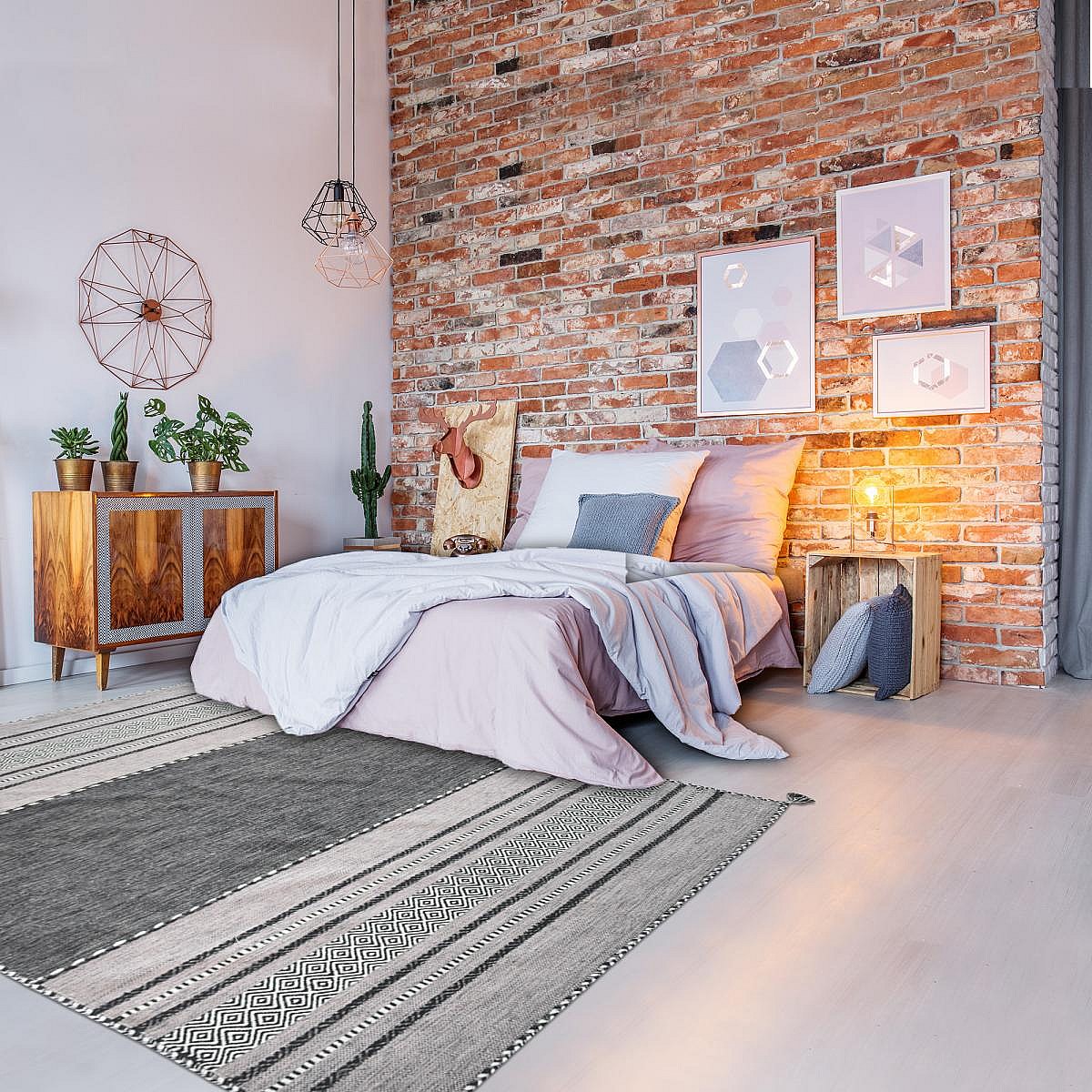 Tapis kilim 200x300 rectangle tissé en coton gris motif géométrique PATSHY