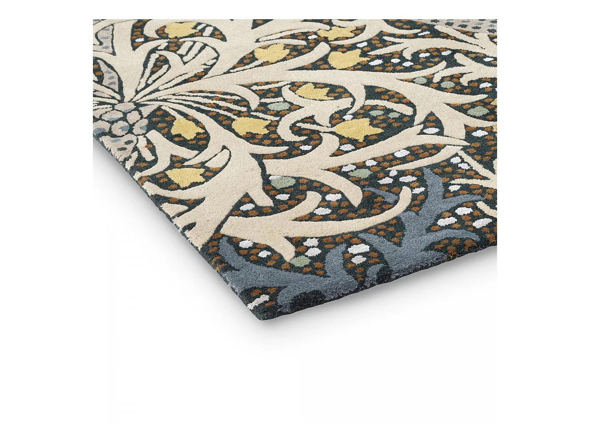 tapis chambre 170x240 fait à la main en laine bleu et jaune motif floral