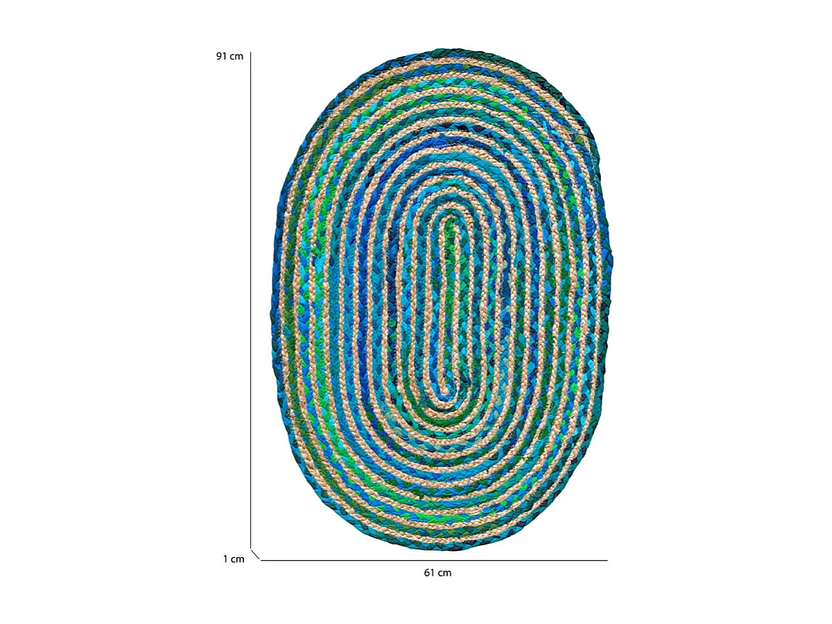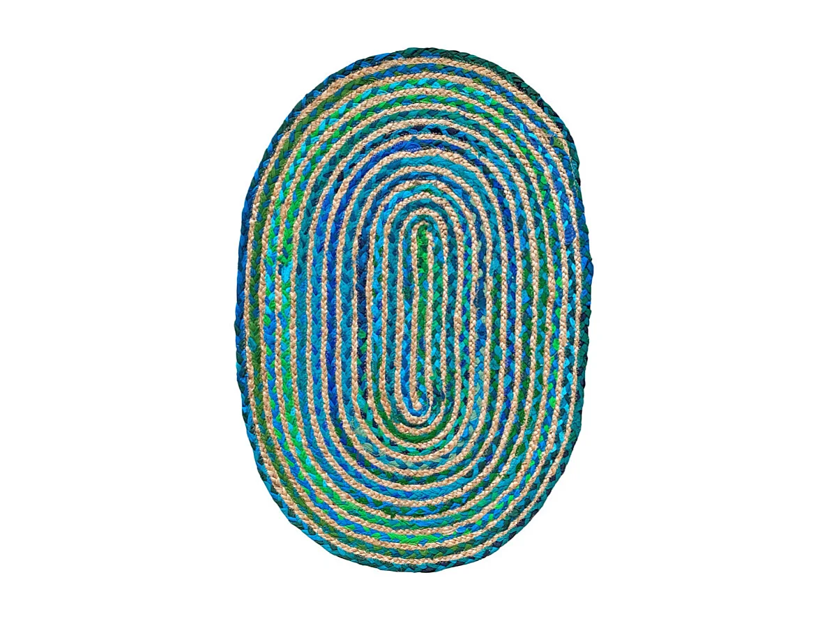 Tapis ovale 60 x 90 cm tressage en jute et tissu bleu / vert - CLOPIN