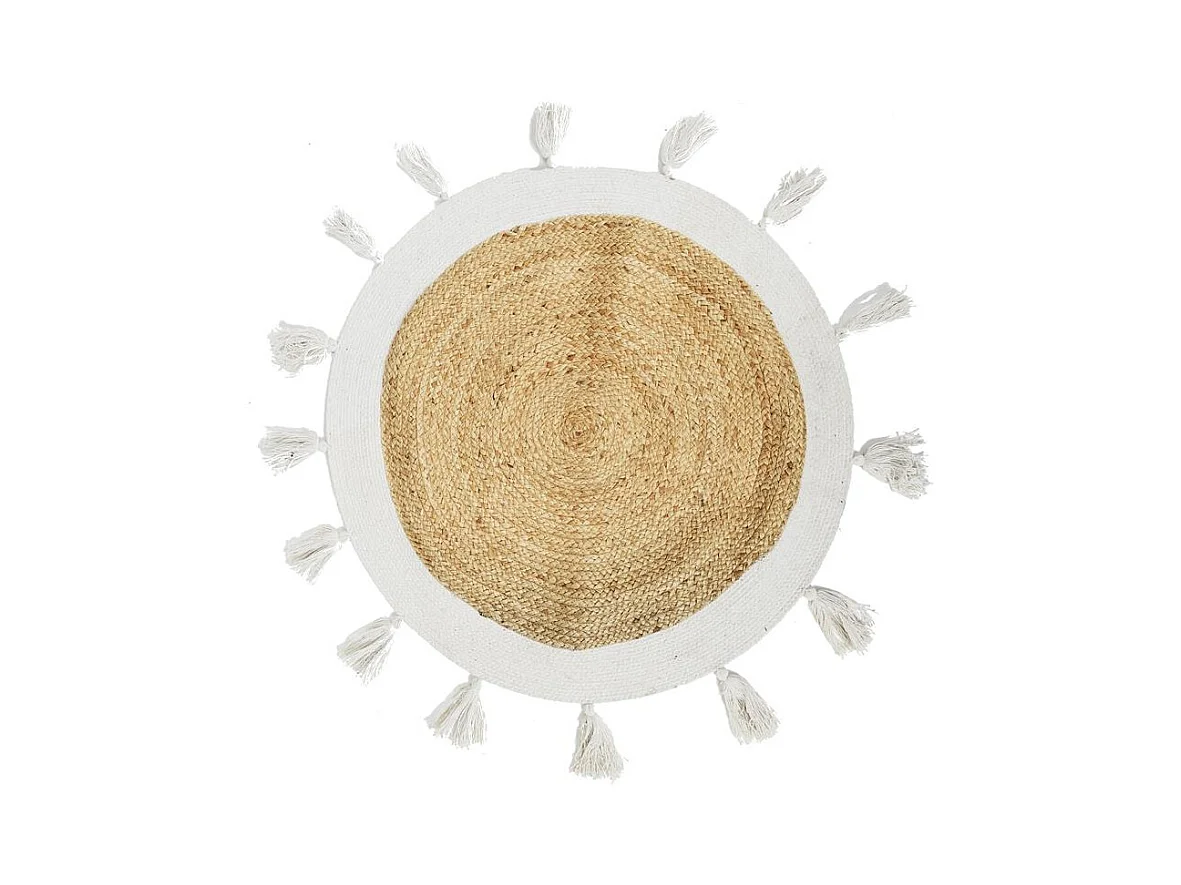 Tapis Rond Jute Pompons Blanc 80cm Noir