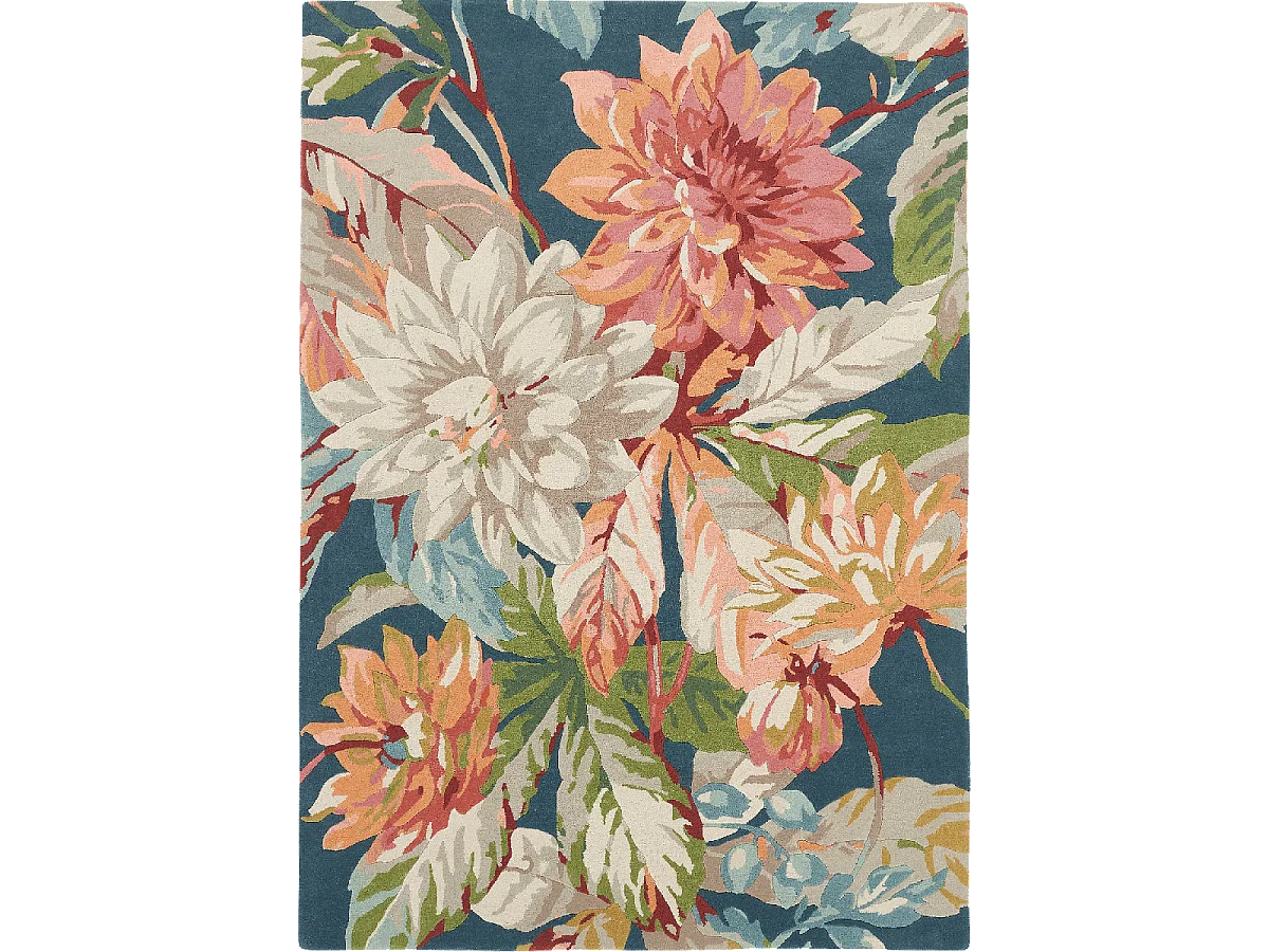 tapis salon 200x280 fait à la main en laine bleu et orange motif floral