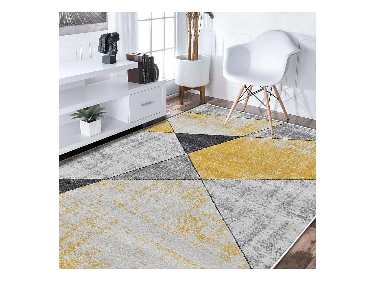 tapis salle à manger 280x380 tissé jaune et gris rectangle motif géométrique