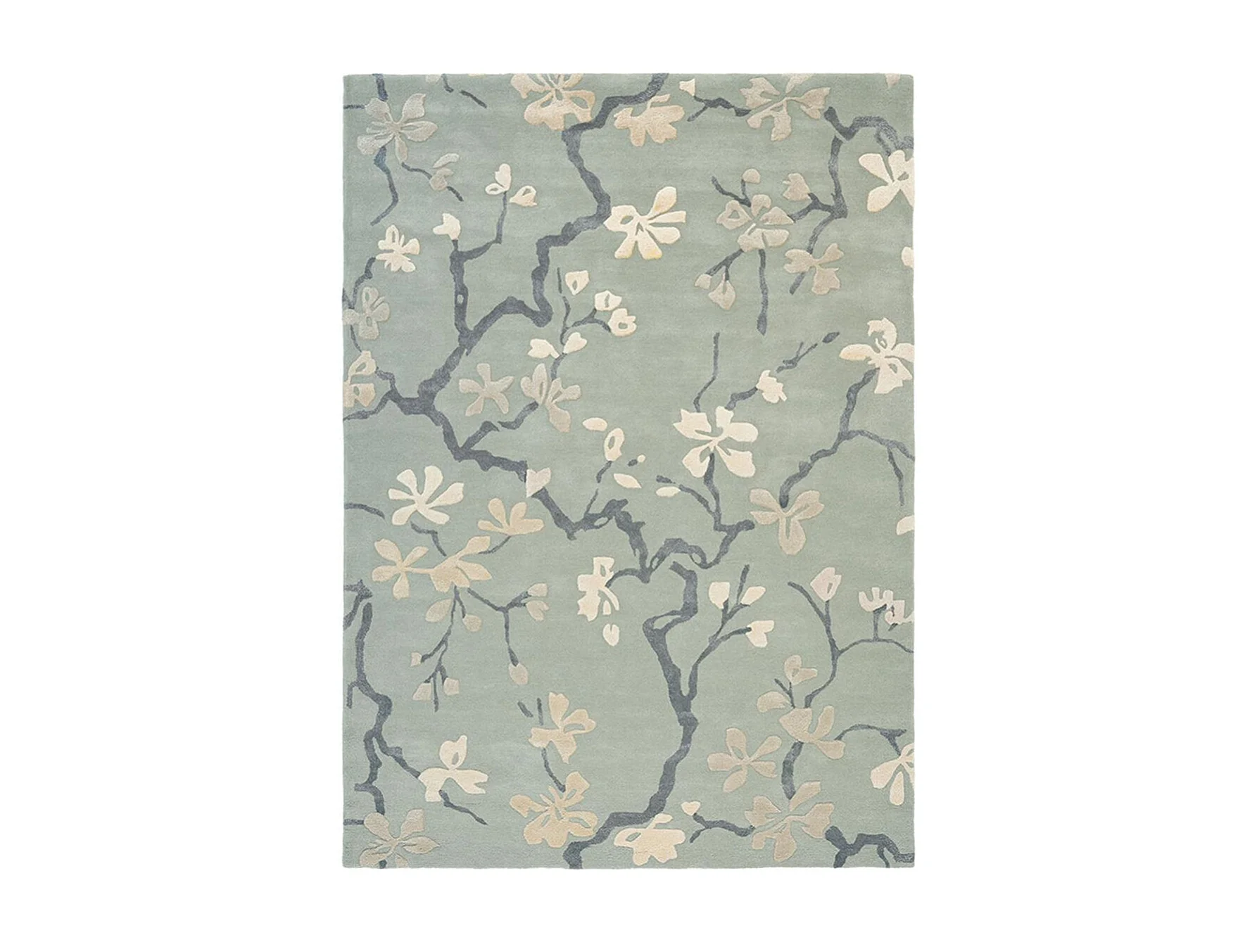 tapis entrée 140x200 fait à la main en laine bleu et gris rectangle motif floral