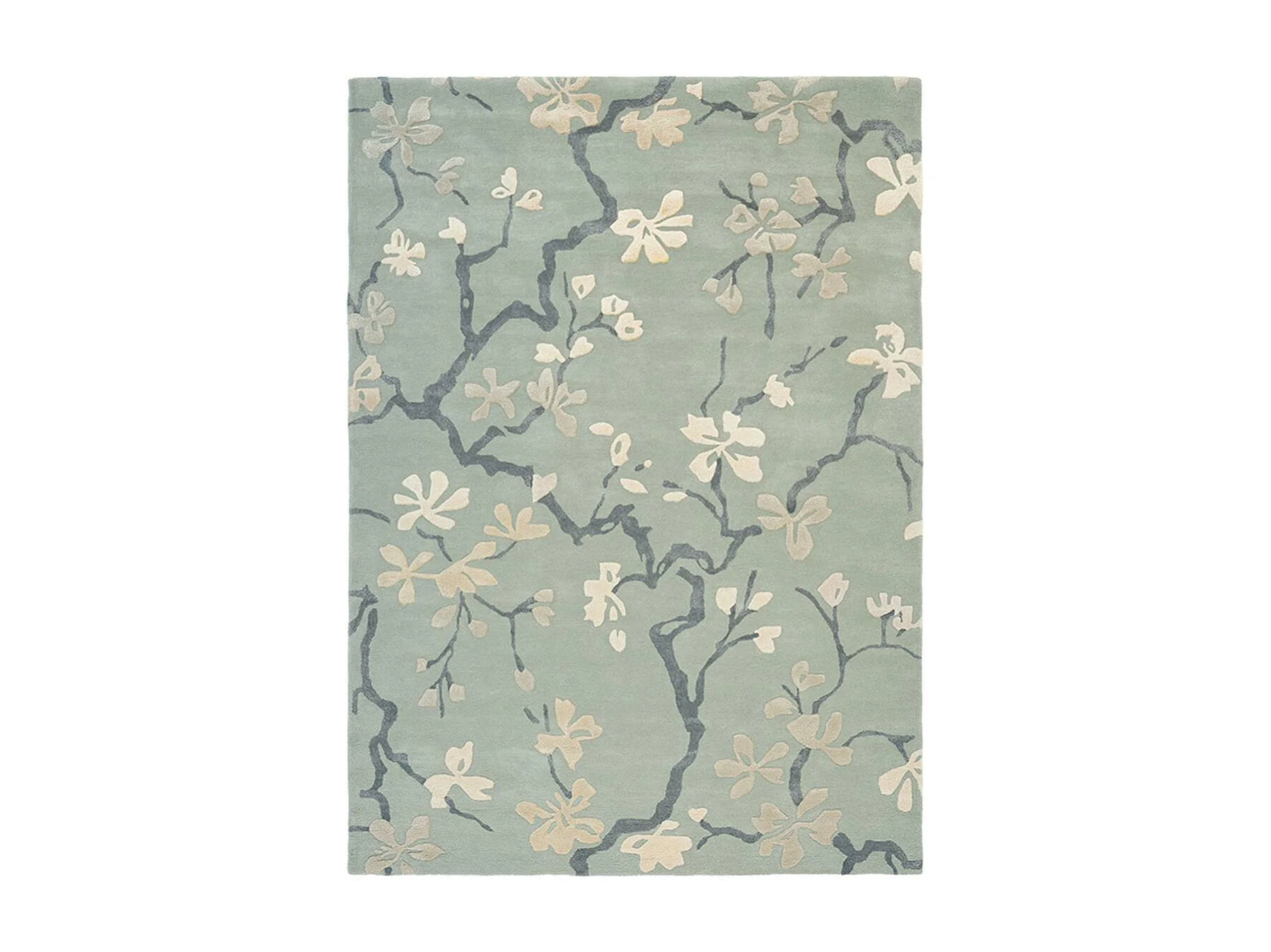 tapis salon 200x280 fait à la main en laine bleu et gris rectangle motif floral