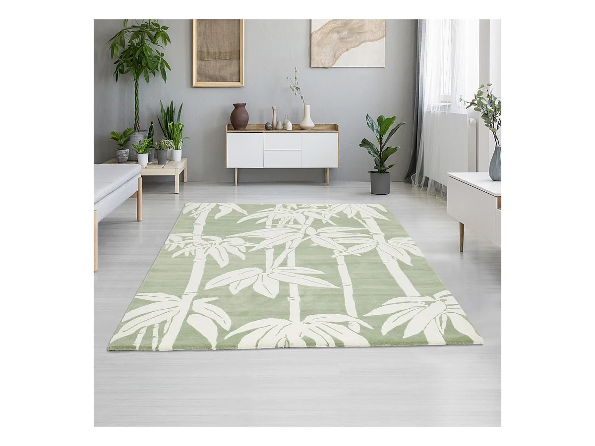 tapis salle à manger 200x280 fait à la main en laine vert gris et crème