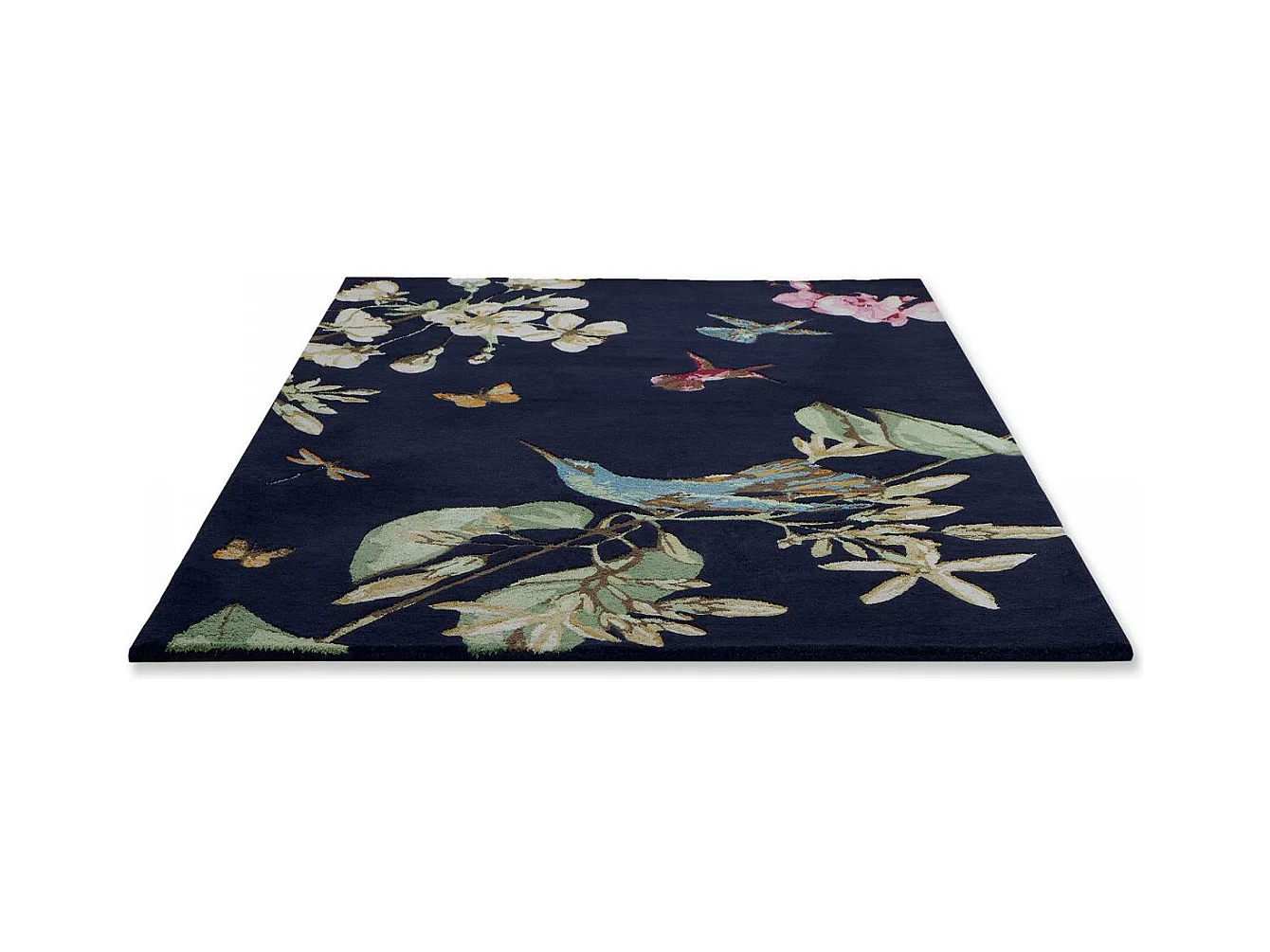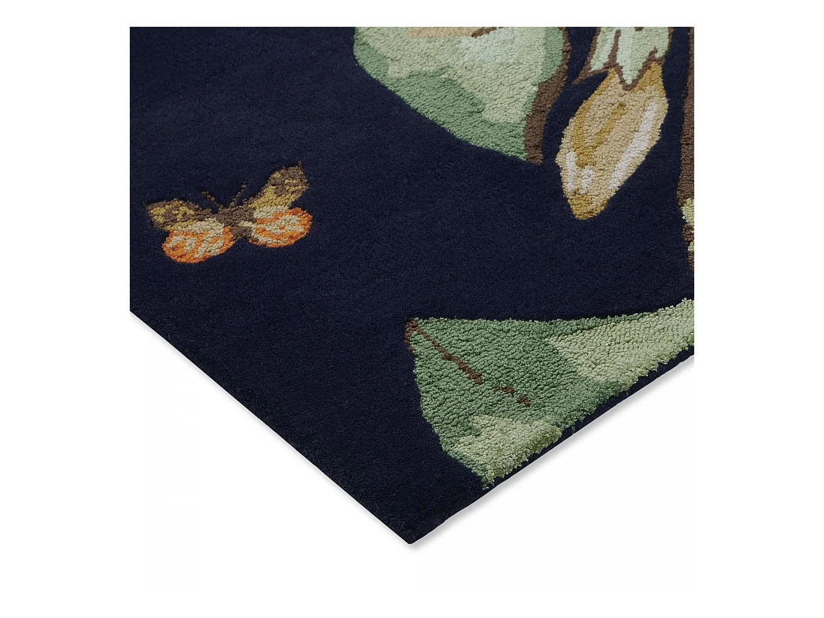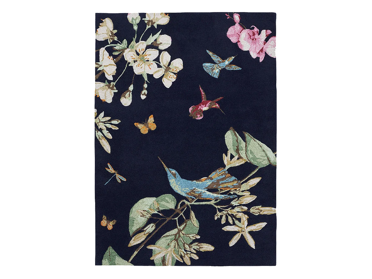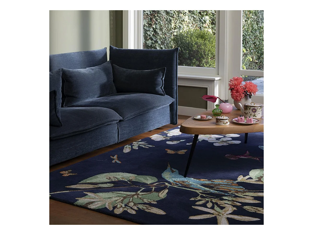 tapis salon 200x280 fait à la main en laine bleu marine et vert motif floral