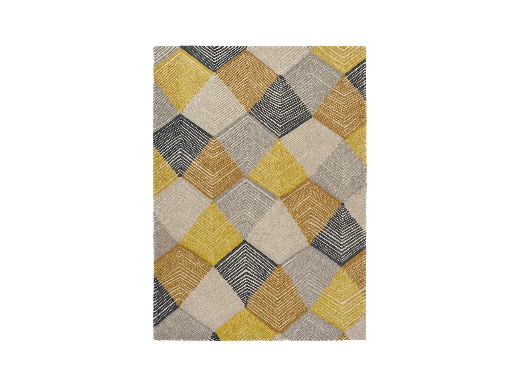 tapis chambre 170x240 fait à la main en laine jaune et gris motif géométrique