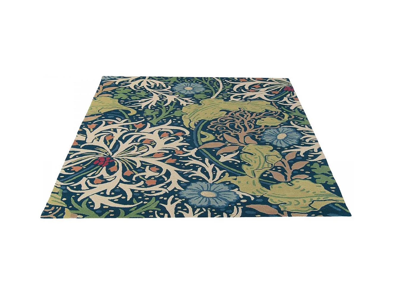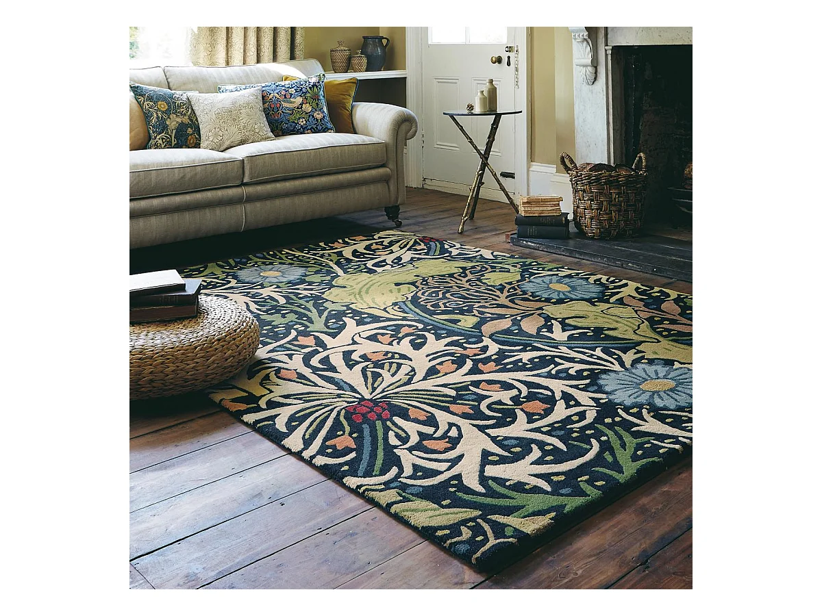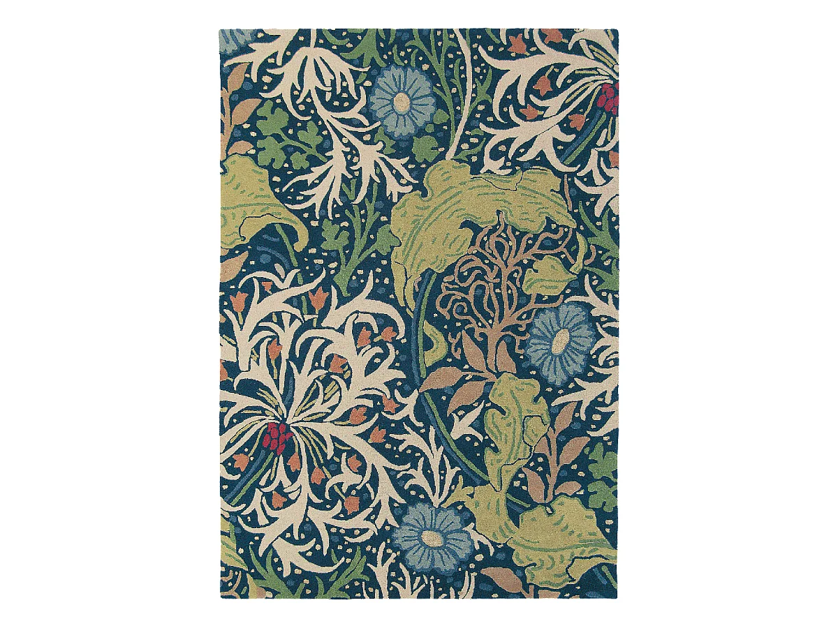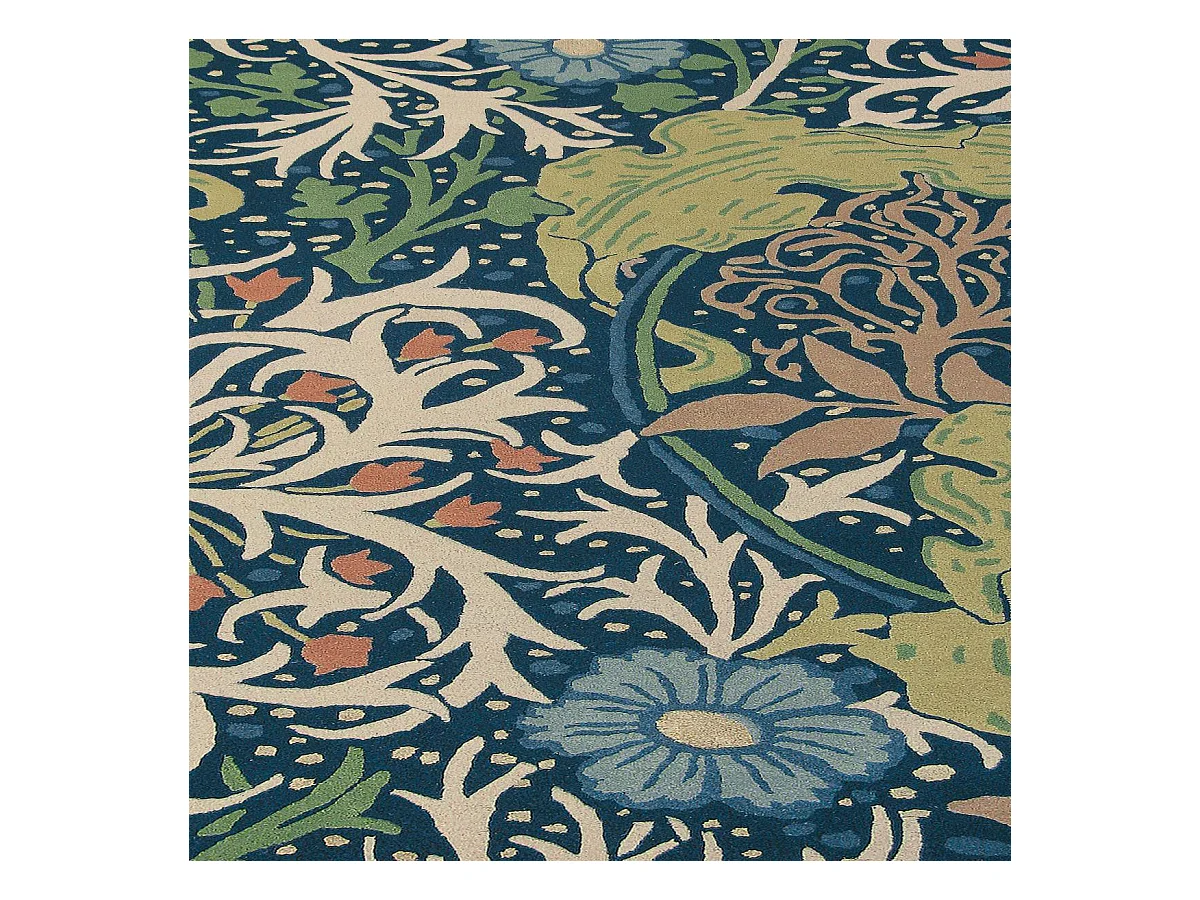 tapis entrée 140x200 fait à la main en laine bleu marine et vert motif floral