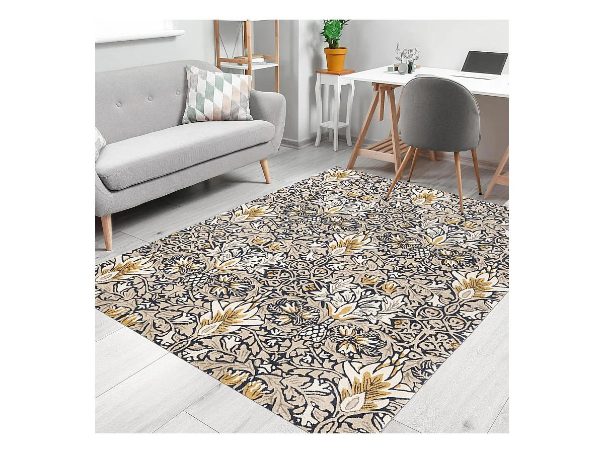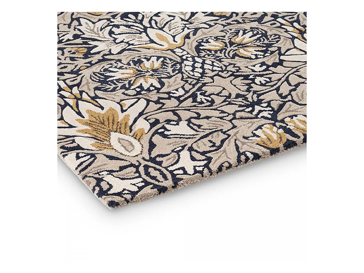 tapis salon 200x280 fait à la main en laine indigo et beige motif floral