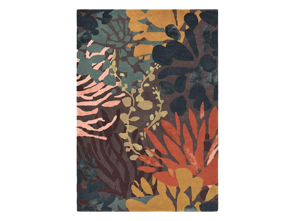 tapis salle à manger 250x350 tissé en laine noir et orange motif floral