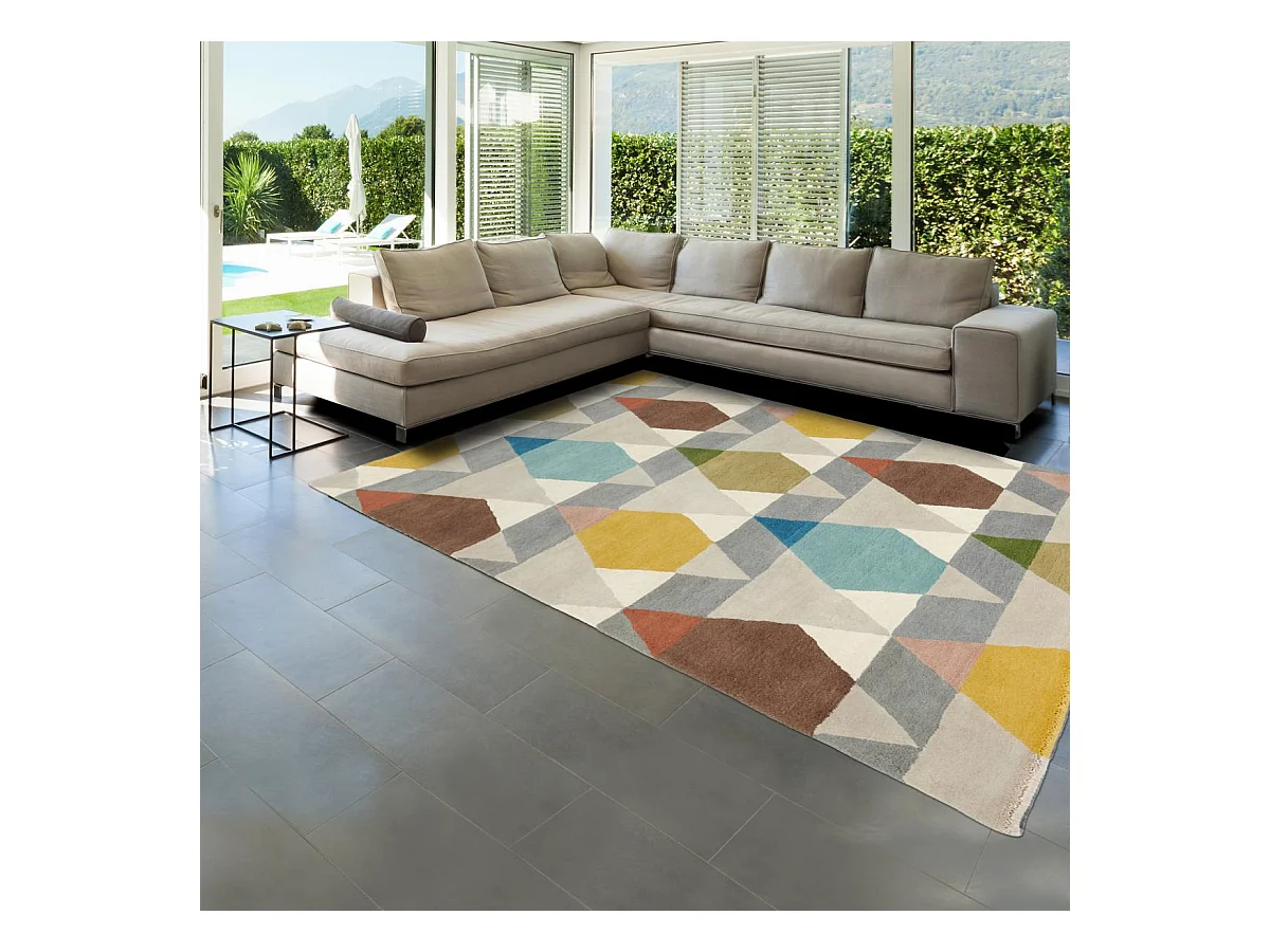 tapis chambre 160x230 tissé en laine gris et jaune rectangle motif géométrique