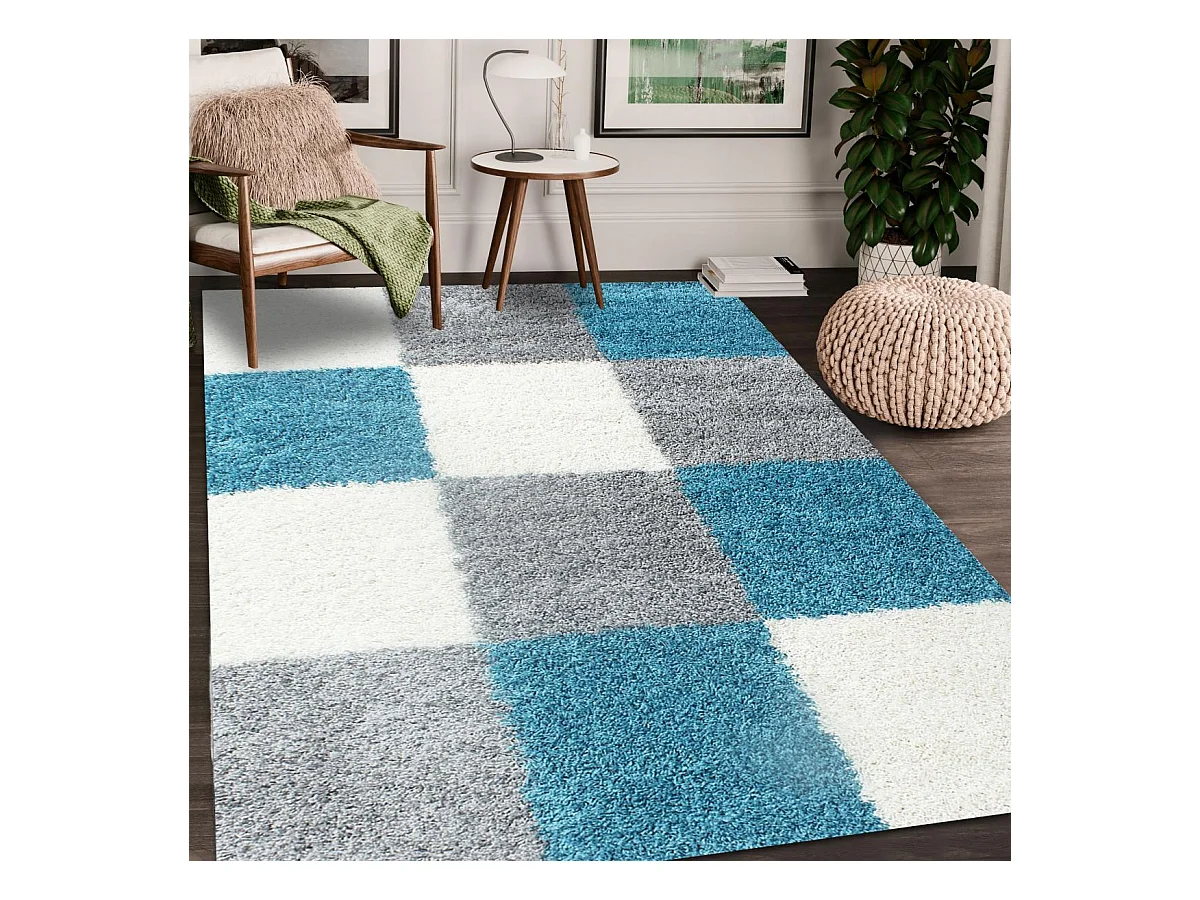 Tapis poils longs shaggy 80x250 rectangle tissé bleu ciel et gris motif damier