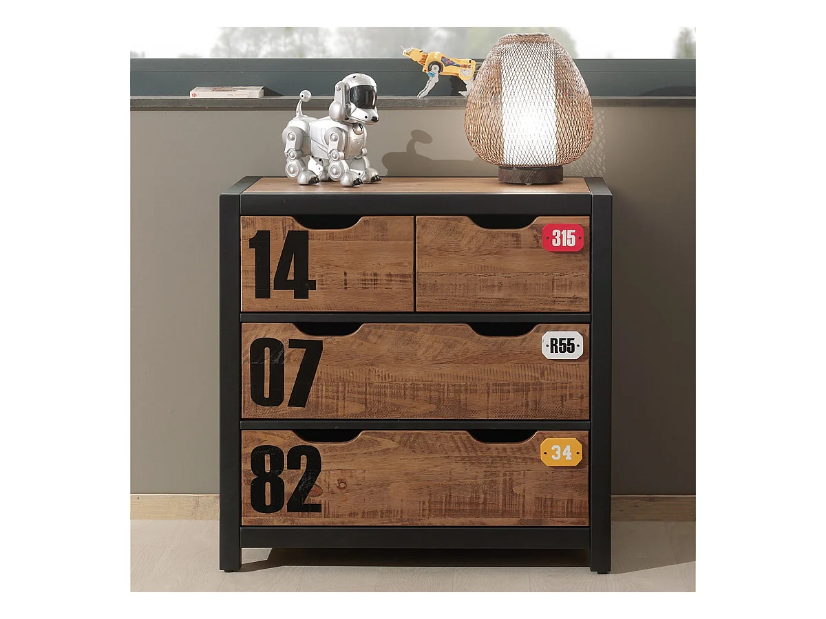 TCHAD - Commode 4 Tiroirs en Pin Massif avec Motifs